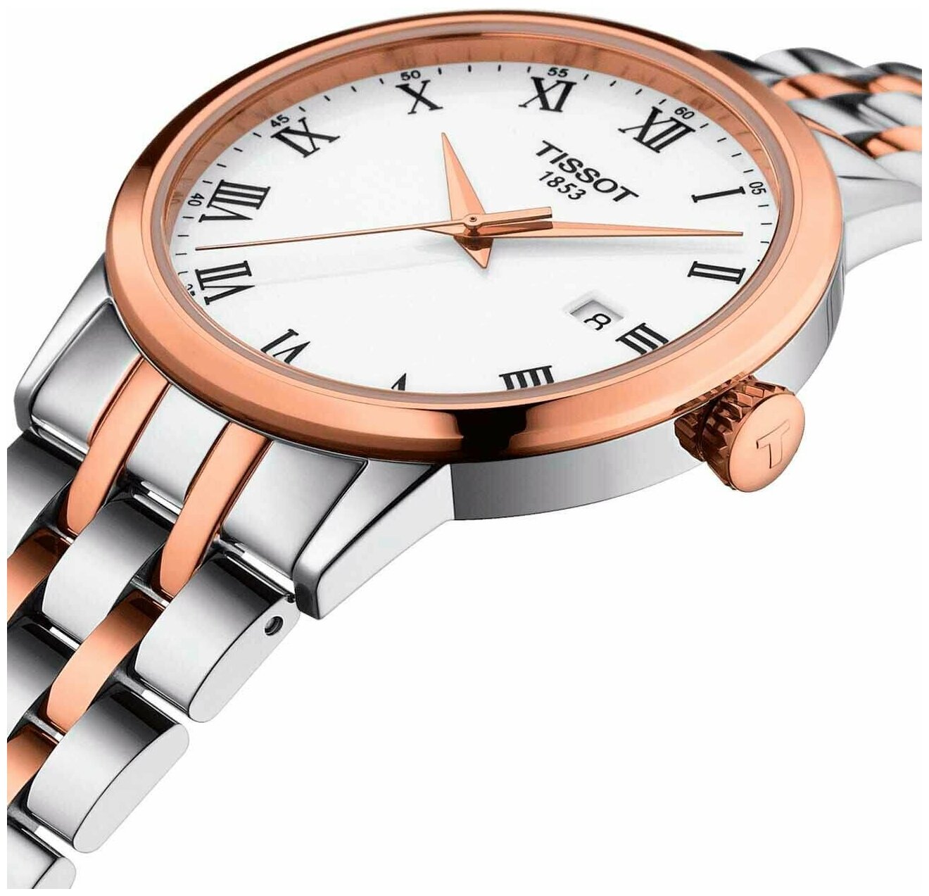 Лучшие цены. Мужские Швейцарские кварцевые часы TISSOT CLASSIC DREAM. Швейцарский кварцевый механизм - ETA F06.115 Калибр - 11 1/2 . Драгоценных камней в механизме -3. Корпус часов выполнен из нержавеющей стали 316L c PVD покрытием цвета розового золота. Диаметр - 42 мм. Циферблат белого цвета с римскими цифрами. На часовой метке 3 расположено окно даты. Часы имеют E. O. L - индикатор заряда батареи, с его помощью часы, путем перескакивания секундной стрелки через 4 деления, уведомят о необходимости скорой замены. Магазины в вашем городе.