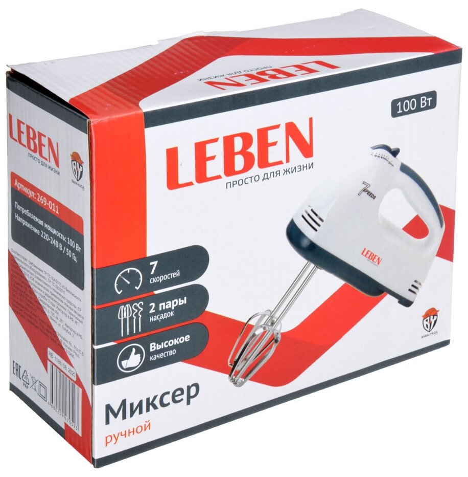 LEBEN Миксер ручной, 100Вт, 7 скоростей, 2 пары насадок из нерж.стали, корпус пластик