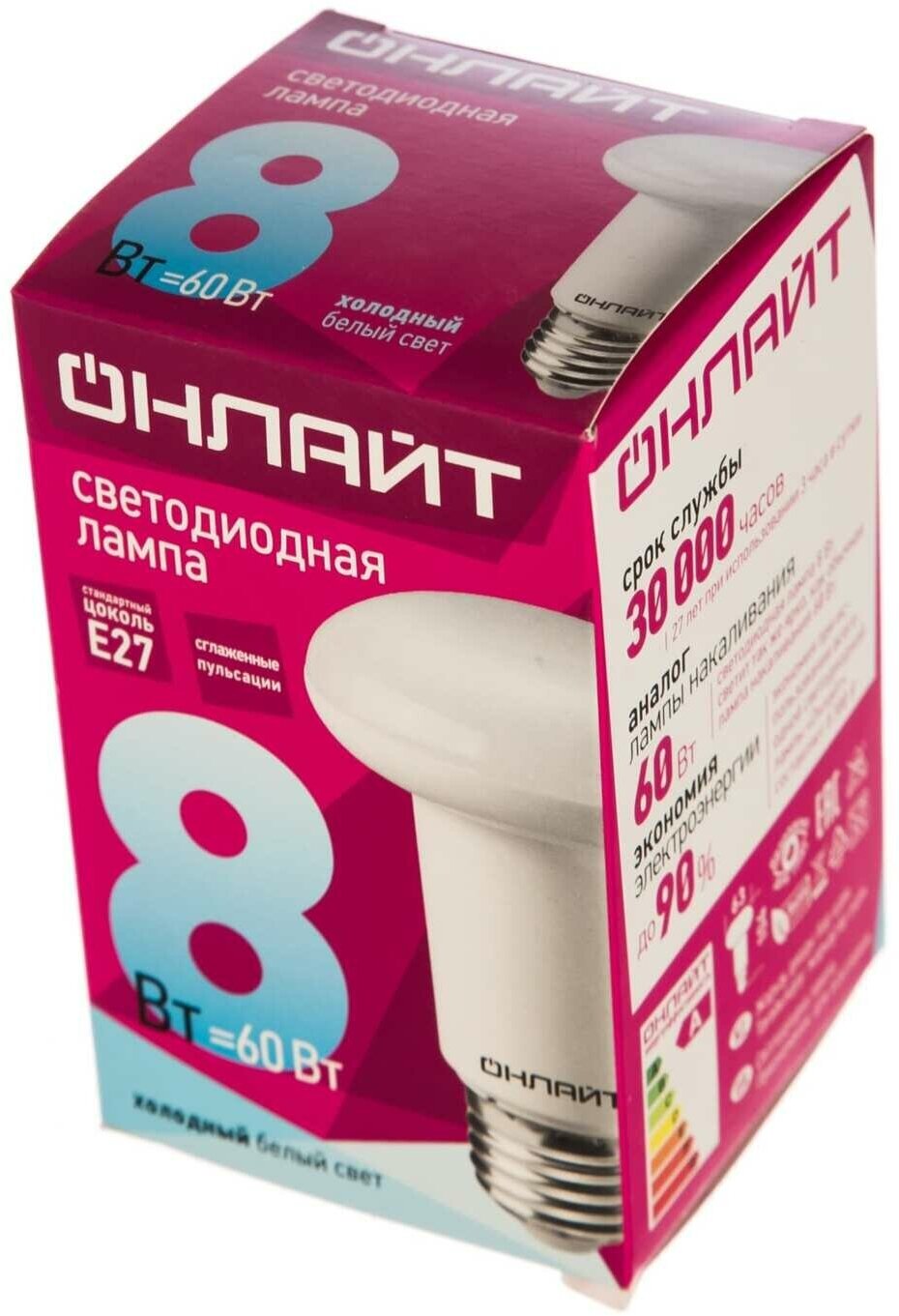 Лампа светодиодная LED Онлайт, E27, R63, 8 Вт, 4000 K, холодный свет