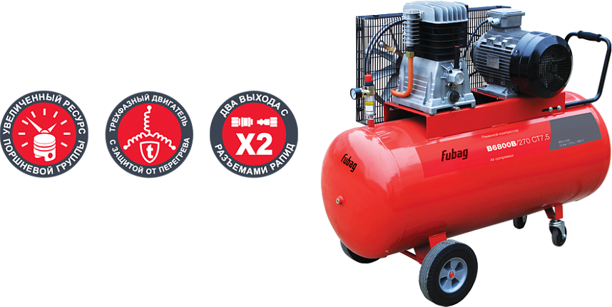 Лучшие цены. Компрессор FUBAG B6800B/270 СТ7.5 45681595 широко используется в авторемонтной и строительной сферах для питания сжатым воздухом различного пневмоинструмента. Агрегат оборудован ресивером на 270 литров, что существенно сокращает интенсивность рабочих циклов. Компрессор этой модели удобен при транспортировке благодаря наличию колес и рукоятки с рельефной накладкой. Агрегат работает от трехфазной электросети. Магазины в вашем городе.