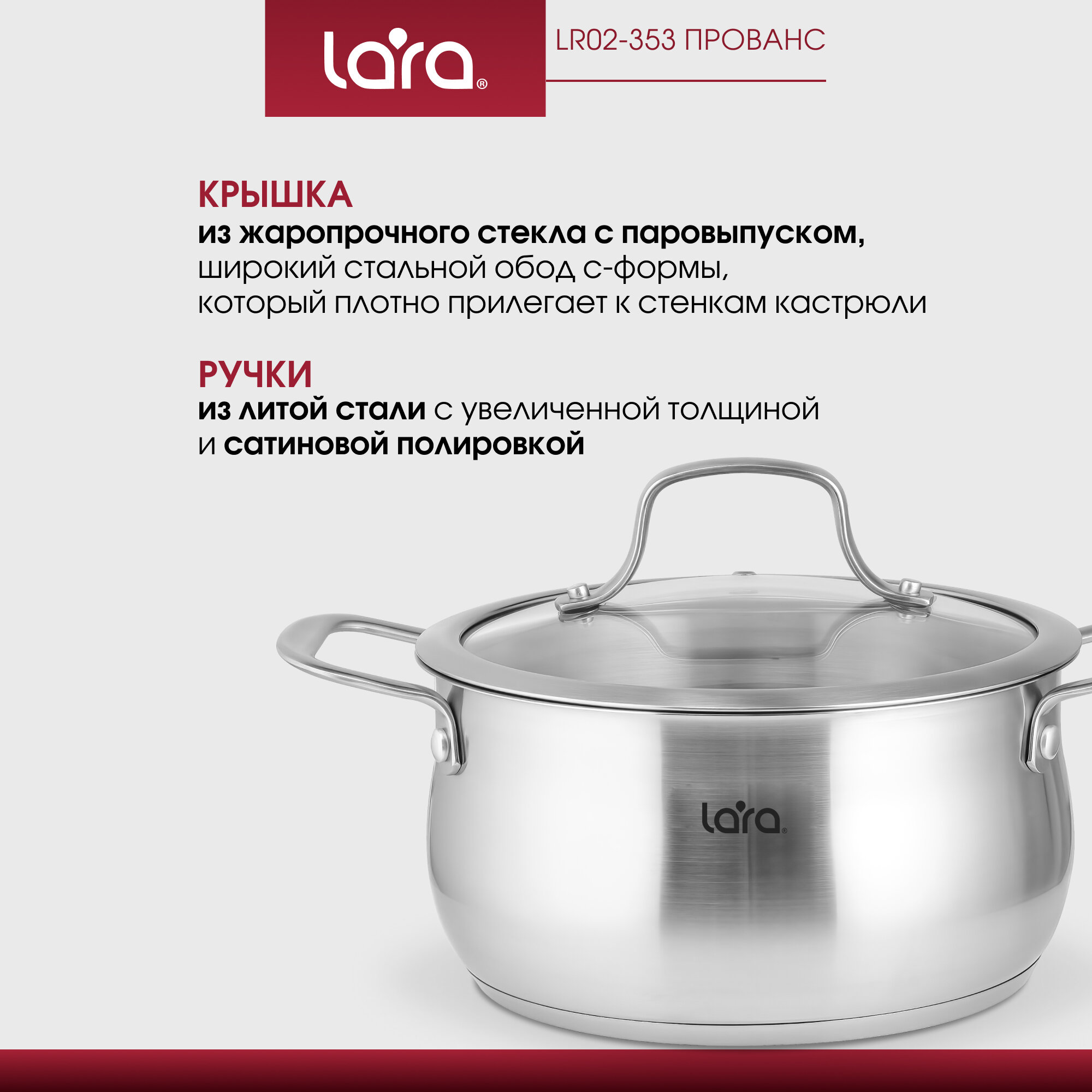 LARA 4680353012910 Кастрюля LARA LR02-352 серия прованс (нерж) 20x10,5см 3.2л, индукционное дно, крышка