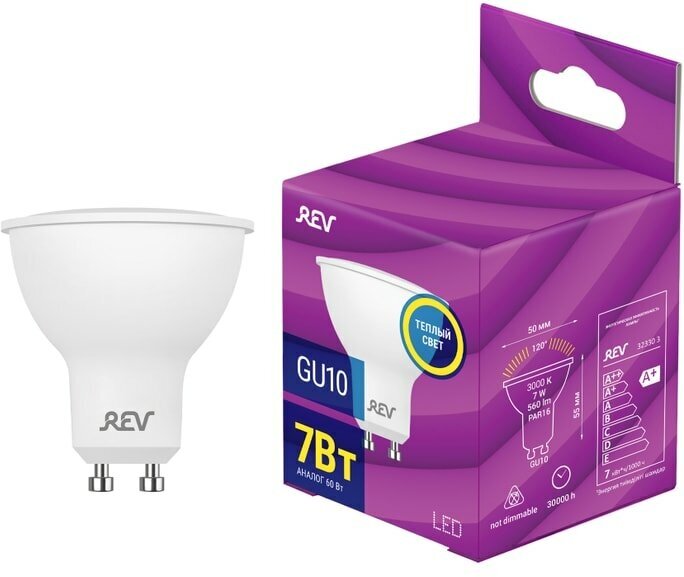 Лучшие цены. Лампа светодиодная REV PAR16 GU10 7W 3000K теплый свет рефлектор 32330 3 - это современное и надежное световое оборудование, которое станет отличным выбором для вашего дома или офиса. Лампа обладает мощностью 7 Вт, что обеспечивает яркое и равномерное освещение. Световой поток составляет 560 лм, а максимальная цветовая температура - 3000 К, что создает теплый белый свет. Тип цоколя GU10 и форма колбы "софит" делают эту лампу совместимой с большинством светильников. Магазины в вашем городе.