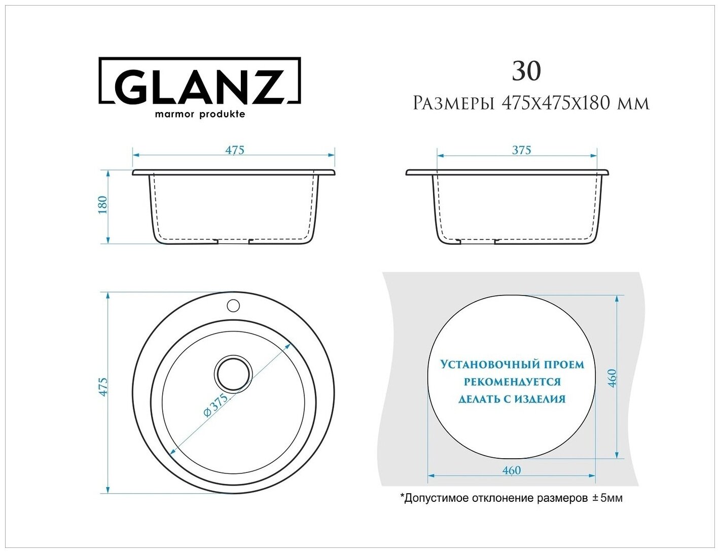 Лучшие цены. Мойка для кухни Glanz J-030-32 47.5x47.5 см, антрацит, с матовой поверхностью Материал мойки: искусственный мрамор Толщина материала: 10 мм Размер основной чаши мойки: 375x375x170 мм Переливное отверстие в чаше мойки Размер выреза в столешнице для установки мойки: 460x460 мм Минимальная ширина шкафа под мойкой: 50 см Диаметр сливного отверстия: 9 см Слив раковины и сифон приобретается отдельно Композитные мойки Glanz изготовлены по современной технологии литьевого камня с дополнительной антибактериальной. Магазины в вашем городе.