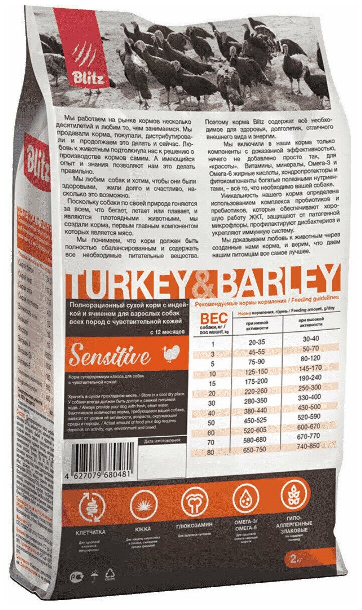 Лучшие цены. Комплексный сухой корм для собак всех пород Blitz Adult Turkey & Barley All Breeds, с индейкой и ячменём, сбалансирован по всем питательным веществам, витаминам и минералам. Это рацион суперпремиум-класса, который предназначен для взрослых животных, имеющих чувствительный желудок, плохо усваивающих привычную пищу (например, на основе курицы или говядины) или страдающих аллергическими расстройствами. Blitz Adult Turkey — корм для особенных собак. Магазины в вашем городе.
