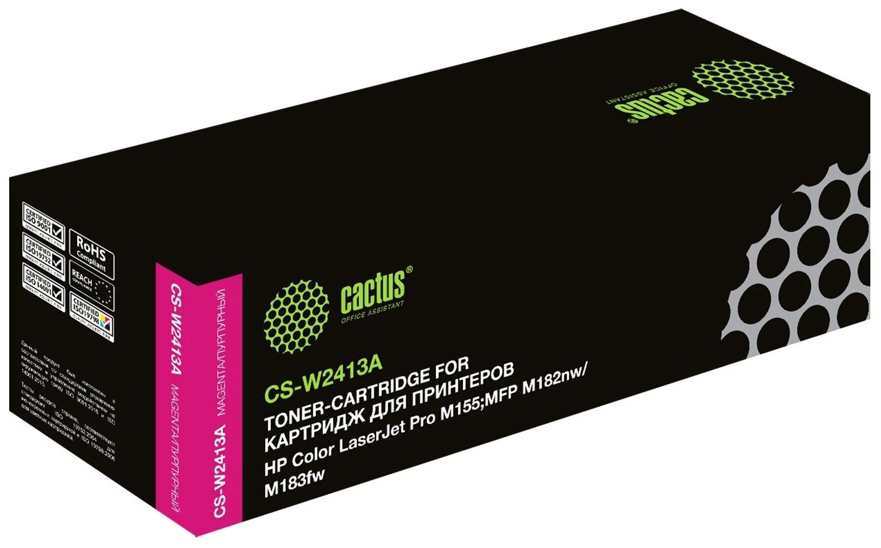 Лучшие цены. Лазерный картридж Cactus CS-W2413A предназначен для использования в принтерах HP Color LaserJet Pro Компания CACTUS на протяжении десяти лет является одним из ведущих брендов совместимых расходных материалов к печатающей и множительной технике для дома и офиса в России. Продукция CACTUS создана для безупречной работы с вашим принтером или МФУ. Вы можете рассчитывать на профессиональное качество комплектующих и тонера от мировых брендов. Магазины в вашем городе.