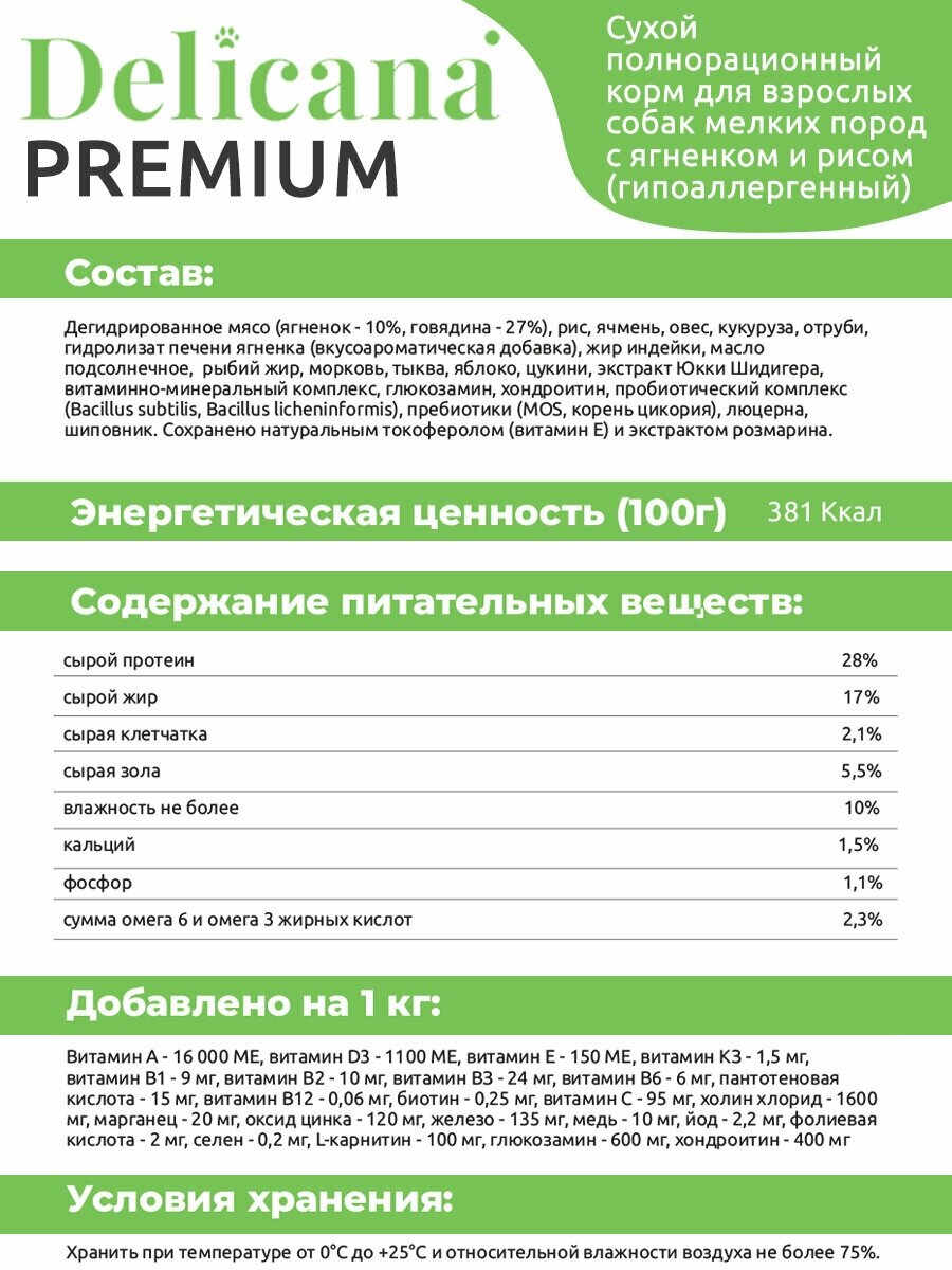 DELICANA Корм сухой для собак мелких пород Ягненок с Рисом, витаминами, минералами и микроэлементами 400 гр