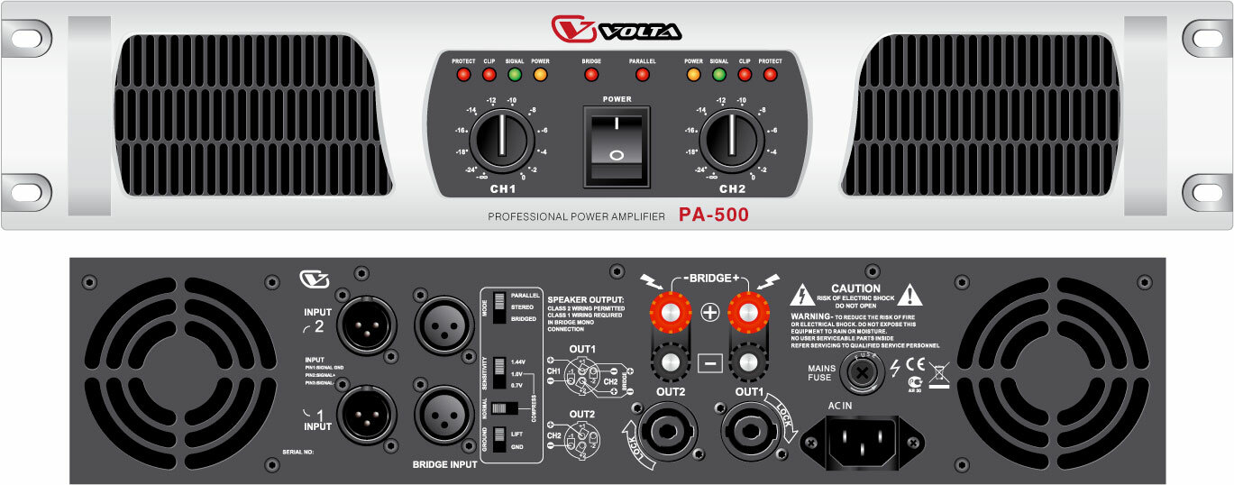 VOLTA PA-500 Усилитель мощности двухканальный. Мощность (8/4/2 Ом) 2х300 Вт/ 2х500 Вт/ 2х800 Вт.