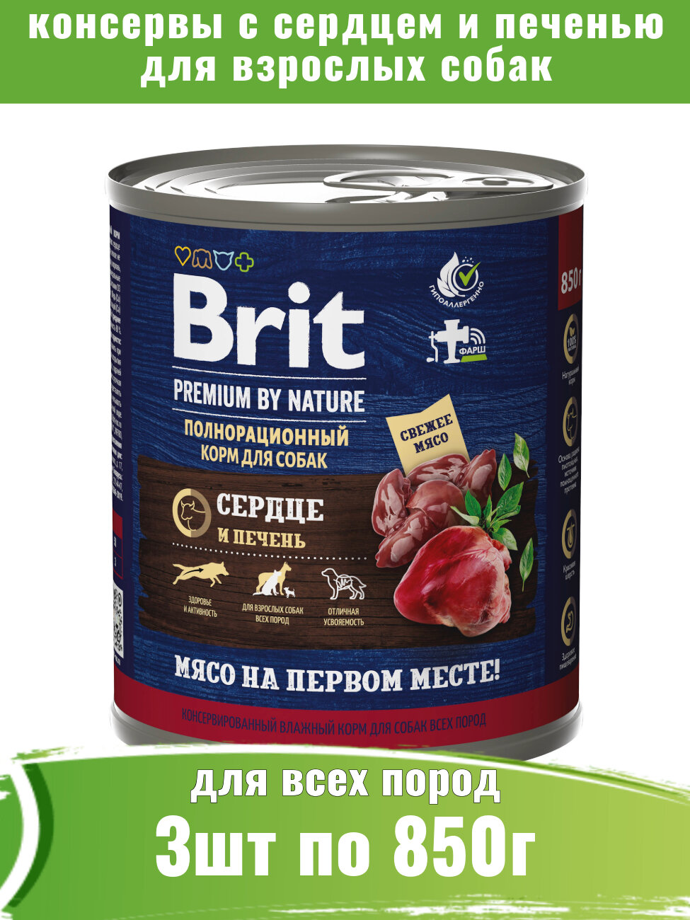 Brit Premium by Nature 3шт по 850г с сердцем и печенью консервы для собак всех пород