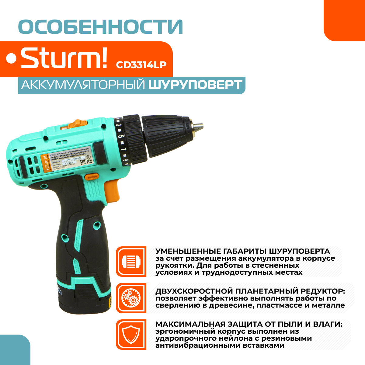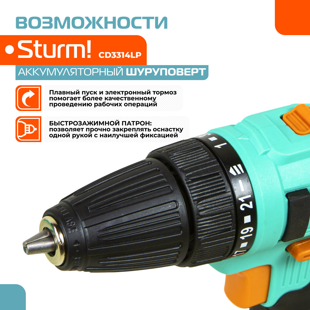 Аккумуляторная дрель-шуруповерт Sturm! CD3314LP 26 Н·м