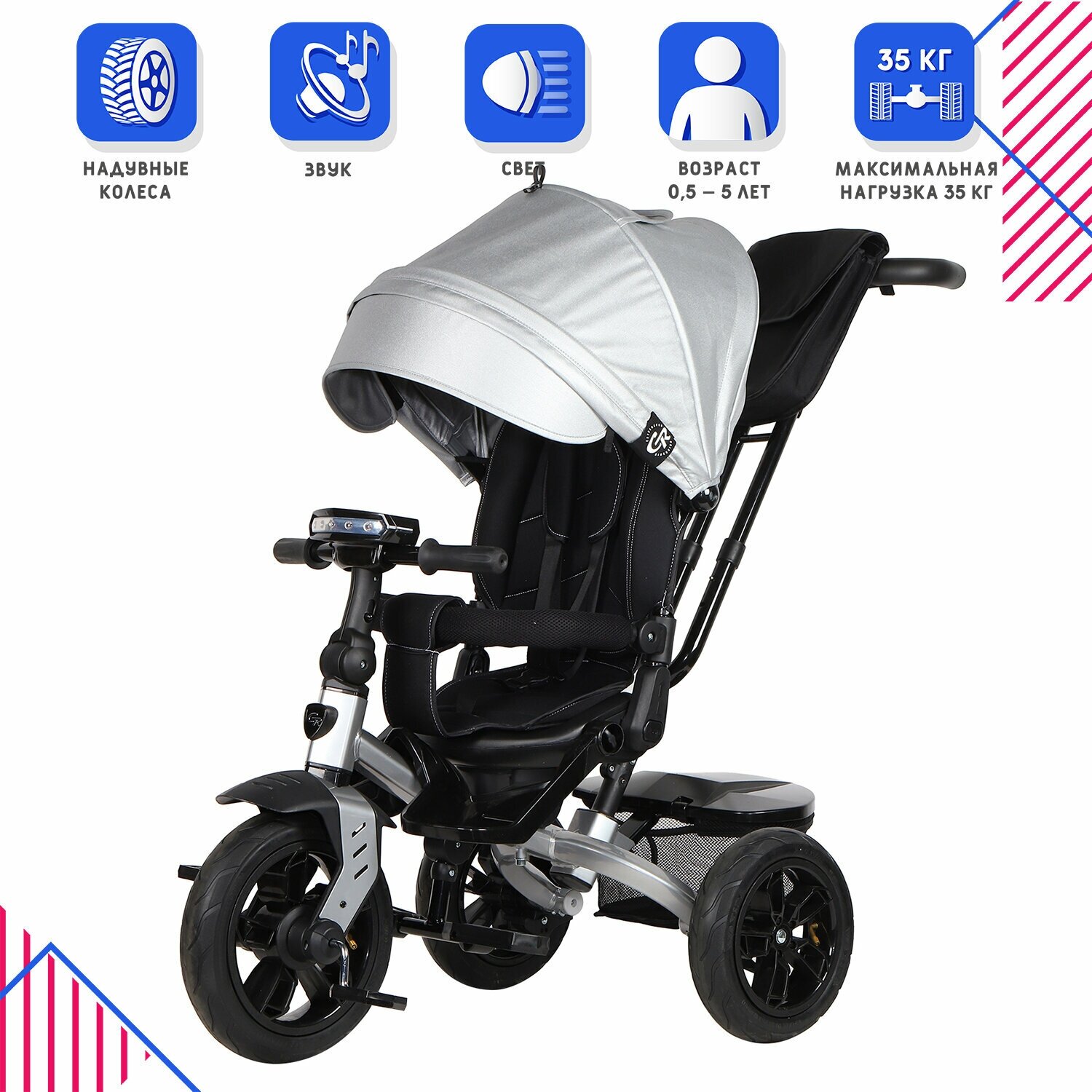 Велосипед детский трехколесный ТМ "CITY-RIDE LUNAR". Велосипед для малышей с подножками. Пятиугольная рама, складная крыша D600, фара свет/звук, подножки, надувные колеса 12"/10", ножной тормоз, поворот сиденья на 360гр. Цвет платиновый