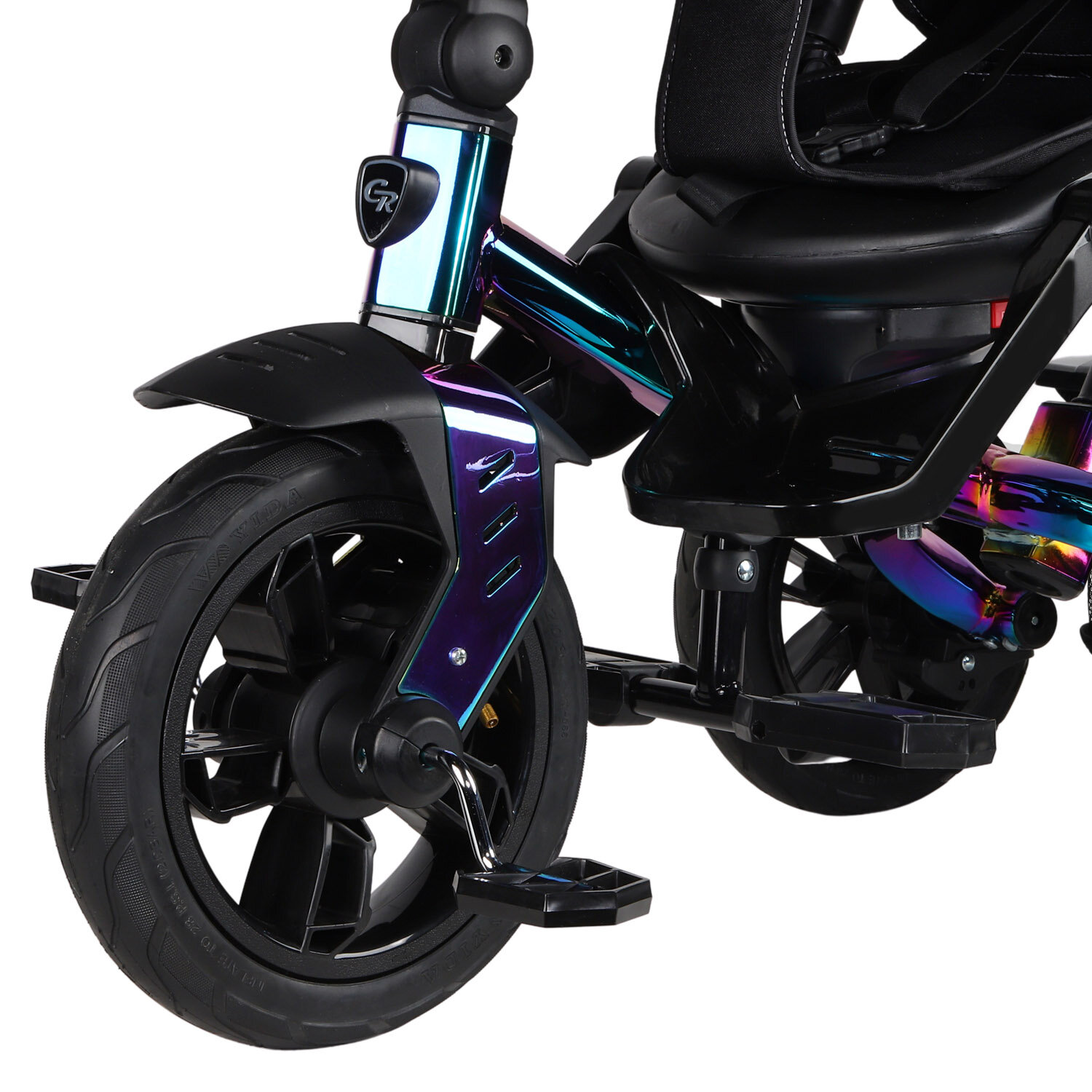 Велосипел детский трехколесный ТМ "CITY-RIDE LUNAR". Пятиугольная рама, складная крыша D600, фара свет/звук, подножки, надувные колеса 12"/10", ножной тормоз, поворот сиденья на 360гр. Цвет черный, хамелеон