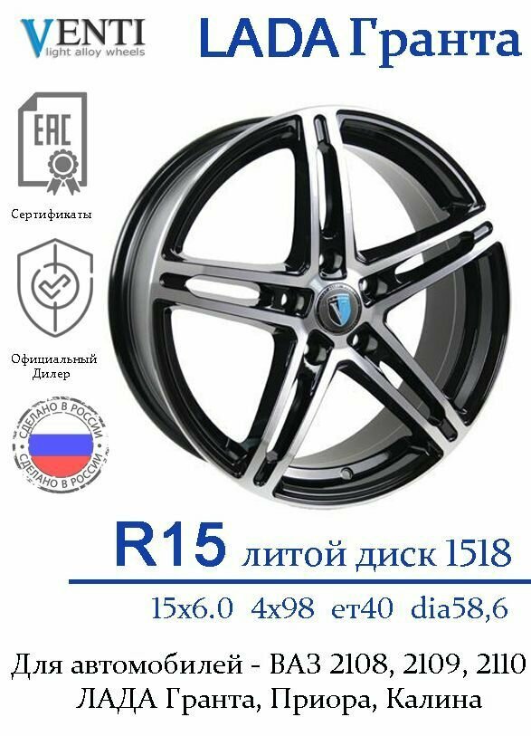 Литые колесные диски Venti 1518 6x15 4x98 ET40 D58.6 Чёрный с полированной лицевой частью (V1518-615-586-4x98-40BD)