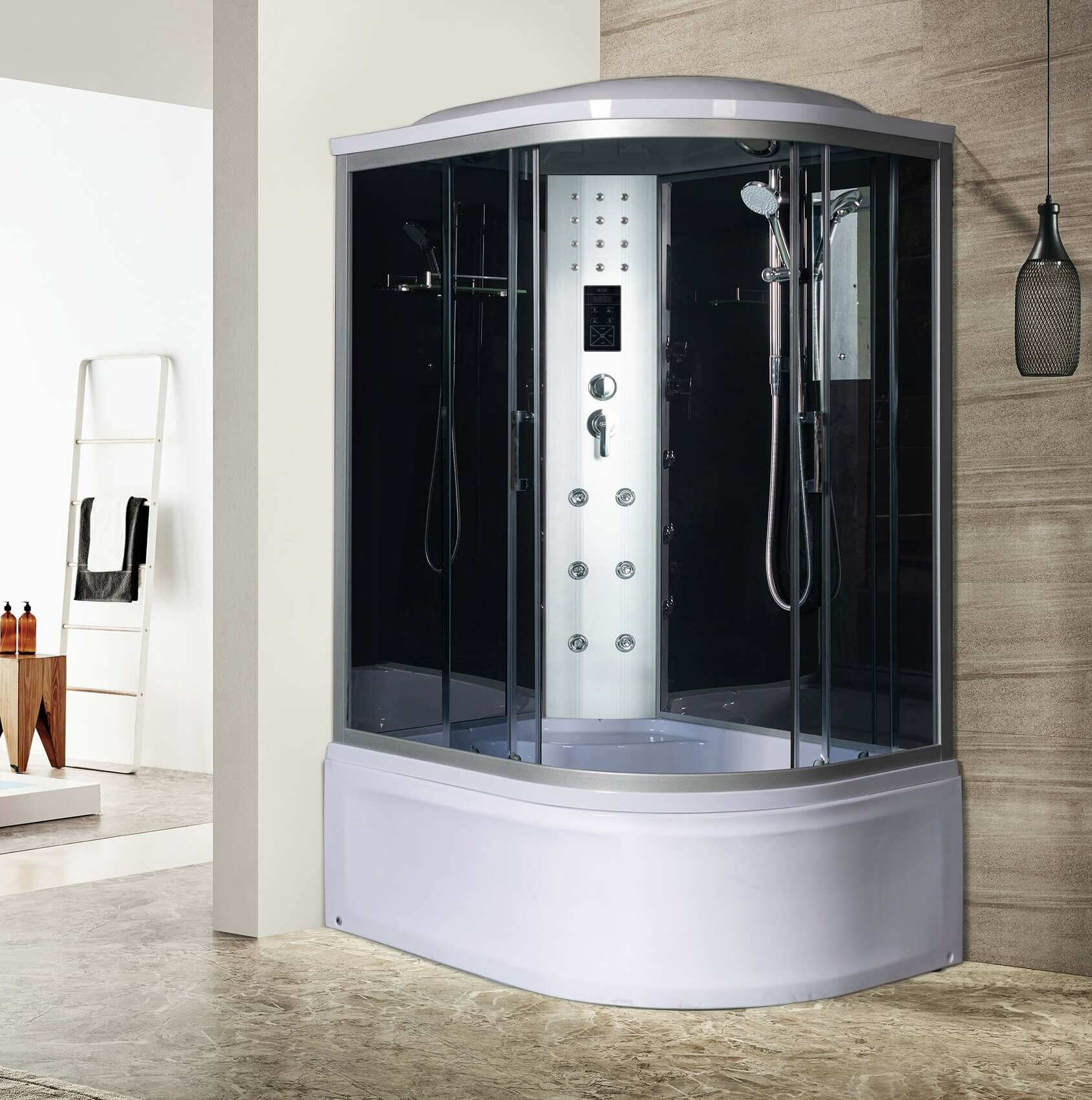 Лучшие цены. Размер 120х80х210 см Угол слева Низкий 46 см (глубина 33 см) акриловый поддон Профиль алюминиевый Передние стекла тонированные 4 мм Задняя стенка стекло черное 4 мм Радио Подсветка Гидромассаж спины (6 форсунок). Магазины в вашем городе.