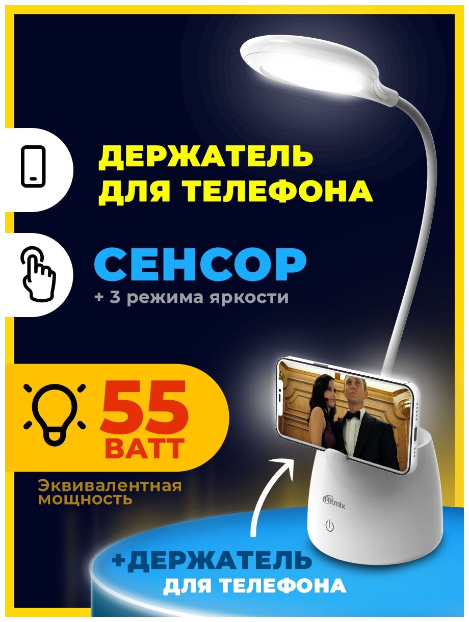 Настольные лампы Лампа настольная Ritmix LED-530, 5 Вт, 300 лм, 6000К, димер, с подставкой для телефона, белый
