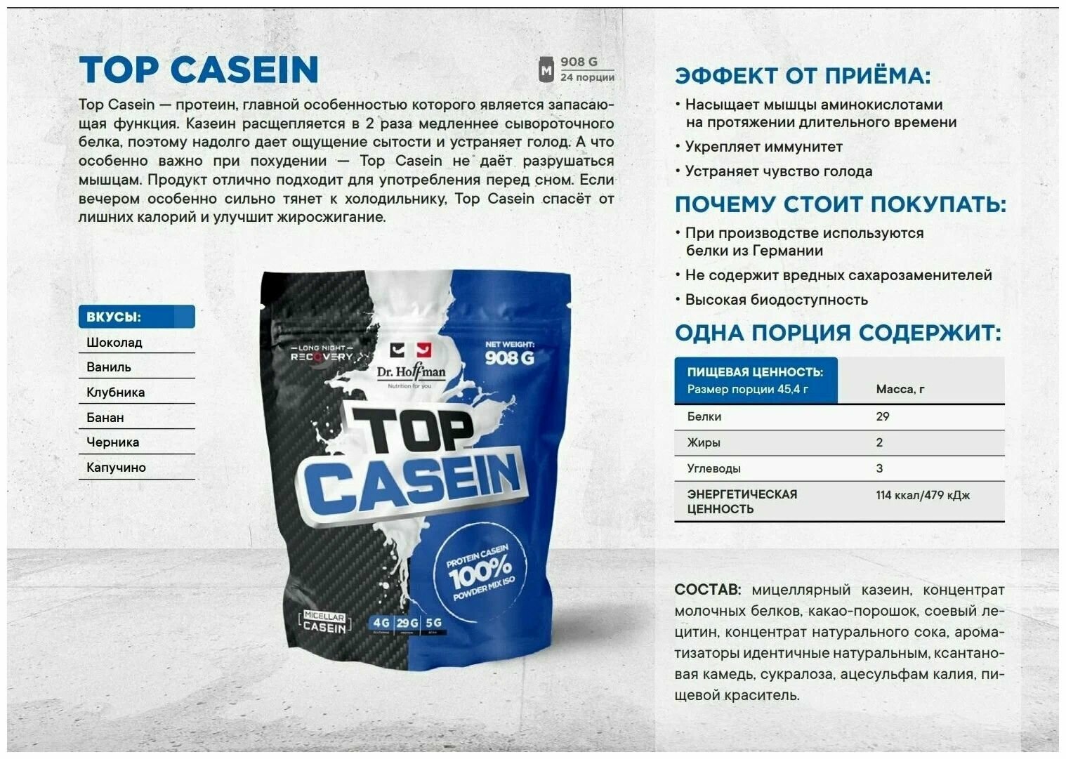 Лучшие цены. Казеиновый протеин Top Casein известного производителя спортивных добавок Dr. Hoffman. Продукт разработан с применением современных технологий и сырья высокого качества. Обеспечивает продолжительную подпитку мышц незаменимыми аминокислотами. Энергетическая поддержка мускулатуры при интенсивных тренировках. Добавка пользуется популярностью среди профессиональных атлетов. Востребована любителями, которые активно работают над трансформацией собственного тела. Магазины в вашем городе.
