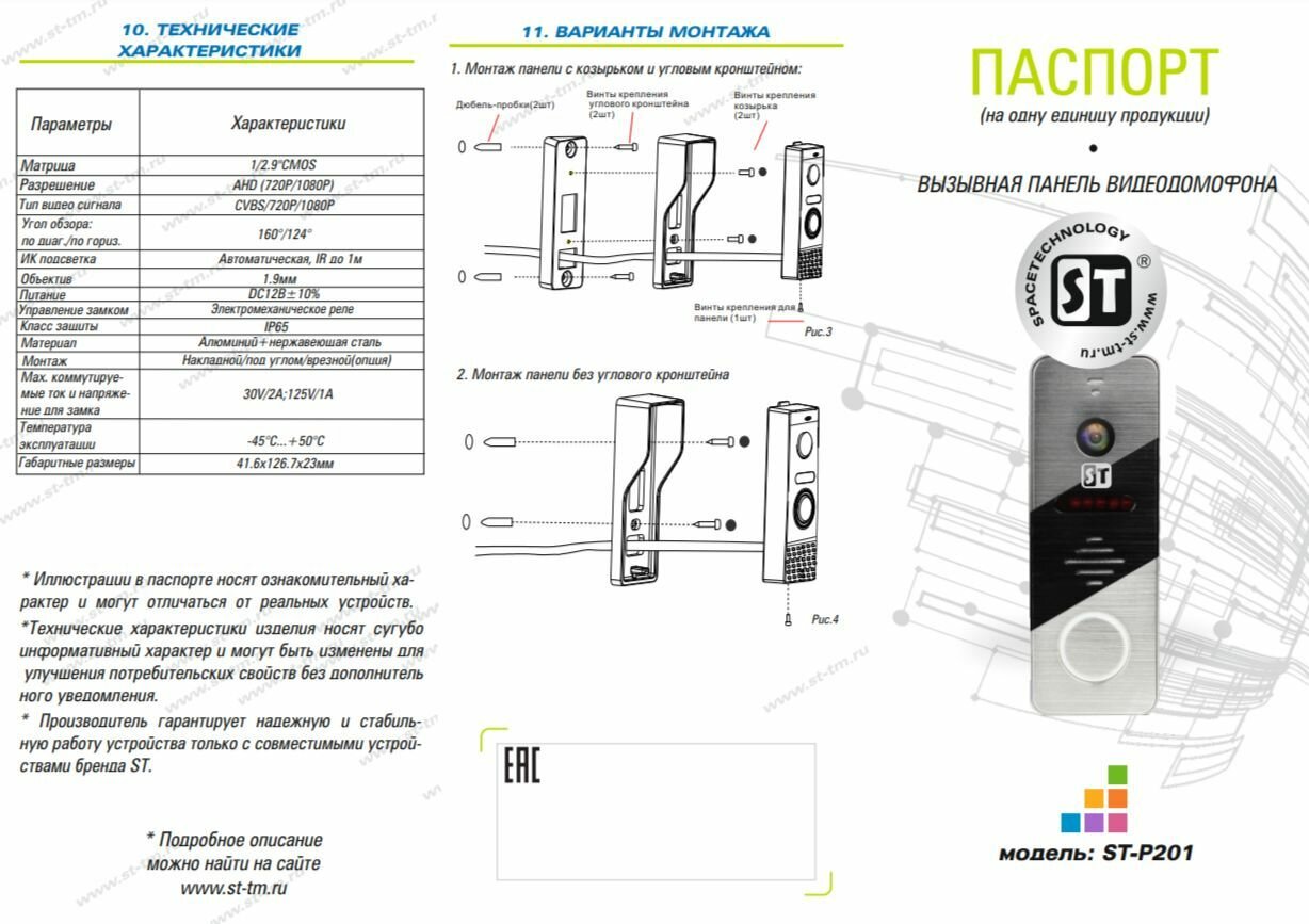 Лучшие цены. Вызывная панель видеодомофона, модель: ST-P201 предназначена для применения совместно с мониторами видеодомофонов ST, поддерживающих стандарт AHD. Панель позволяет вести видеонаблюдение пространства перед панелью и осуществлять голосовую связь с посетителем. Инфракрасная подсветка позволяет получить на экране монитора изображение приемлемого качества, даже при полном отсутствии освещения. Панель обеспечивает видеонаблюдение пространства перед входной дверью и речевую связь с посетителем. Магазины в вашем городе.