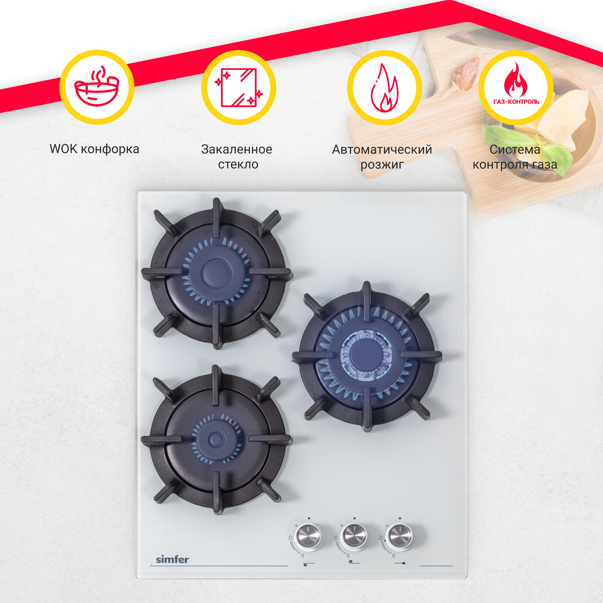 Варочные поверхности Газовая варочная поверхность Simfer H45N35W571 (газ-контроль, WOK конфорка, белое стекло)