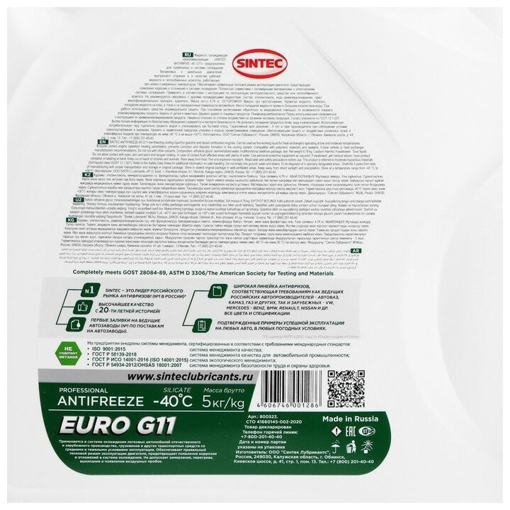 Антифриз Sintec Euro, зеленый G-11, 5 л Sintec 4768578 .