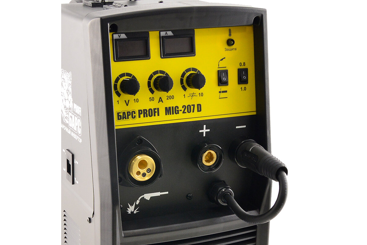 Лучшие цены. Если выбирать профессиональный сварочный полуавтомат, который с легкостью справится не только со сваркой MIG/MAG, но и с MMA, то барс Profi MIG 207 D достойный выбор за разумные деньги! Мощный сварочный аппарат инверторного типа справляется с различными типами сталей и сплавов в среде защитного газа электродной проволокой, а так же ручной дуговой сваркой при помощи штучных электродов. При этом вес аппарата всего 25 килограмм, что делает его мобильным и легко транспортируемым. Магазины в вашем городе.