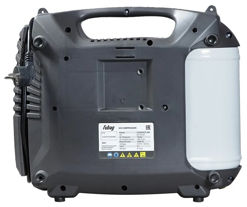 Лучшие цены. [Компрессоры] FUBAG Компрессор COMPACT AIR [6412320] ( Ресивер 5 л, Произв-сть 180 л/мин, Давление 10 бар, Мощность 1300 Вт, Напряжение 230/50 В/Гц, Вес 8.4 кг ) FUBAG Компрессор COMPACT AIR [6412320] ( Ресивер 5 л, Произв-сть 180 л/мин, Давление 10 бар, Мощность 1300 Вт, Напряжение 230/50 В/Гц, Вес 8.4 кг ) Назначение для снабжения чистый сжатым воздухом для накачки небольших изделий, продувки узких водопроводных труб, для чистки поверхности масса(кг). Магазины в вашем городе.
