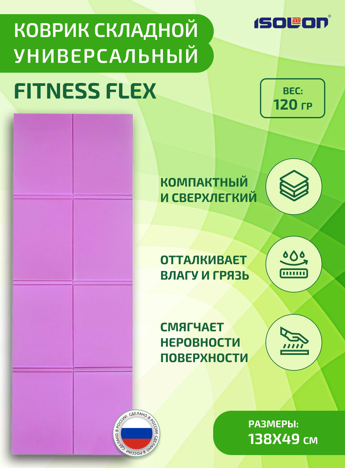Лучшие цены. Коврик туристический складной ISOLON Fitness Flex 138 х 49 х 0,5 см (коврик детский, сидушка туристическая) Коврик складной Fitness Flex это легкий туристический каремат, который компактно складывается по длине и ширине, образуя прямоугольник размером 35 х 25 х 5 см, который удобно переносить или использовать как сидушка туристическая. Пенка подойдет для детей и взрослых не только для походов и прогулок. Магазины в вашем городе.