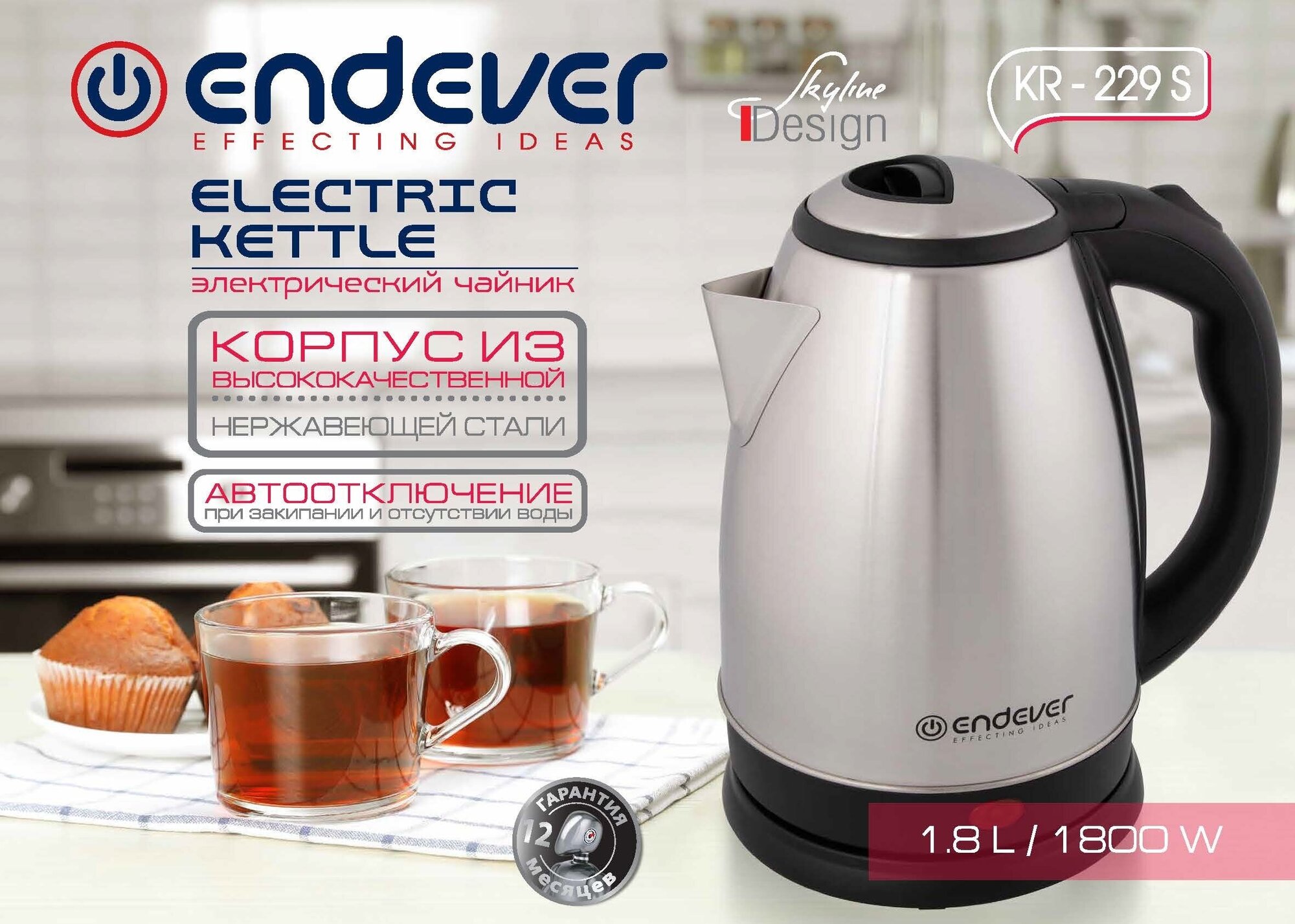 Лучшие цены. Чайник электрический, модель Endever Skyline KR-229S, емкость-1,8л, матовый стальной корпус, черная ручка, дисковый нагревательный элемент, мощность 1800 Вт, напряжение 220В, 12 шт/уп. Магазины в вашем городе.