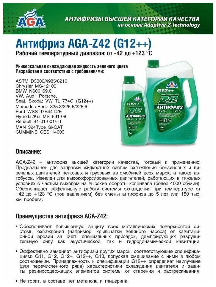 Лучшие цены. Антифриз AGA-Z42/G12++ (AGA048Z/1 кг) Назначение Универсальный антифриз. Предназначен для систем охлаждения бензиновых и дизельных двигателей легковых и грузовых автомобилей всех марок, а также автобусов. Идеален для высокофорсированных двигателей, работающих в тяжелых динамических условиях с частым выходом на высокие обороты коленчатого вала, например, более 4000 об/мин (спортивный стиль вождения, ралли, интенсивный городской цикл). Магазины в вашем городе.