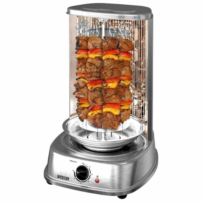 Лучшие цены. Чтобы полакомиться шашлыком, не обязательно ждать лета и поездки на природу! Устройство Mystery приготовит для вас нежное и ароматное блюдо в домашних условиях. Особая конструкция обеспечивает равномерную прожарку каждого куска мяса. Данная модель проста в использовании и не требует специального ухода. ХарактеристикиМощность: 2000 Вт. Функция гриля: есть. Конструкция поддона: вращающаяся. Таймер: 60 мин., звуковой сигнал. В комплекте: 7 шампуров, вертел для мяса и курицы, 2 решётки для рыбы. Магазины в вашем городе.