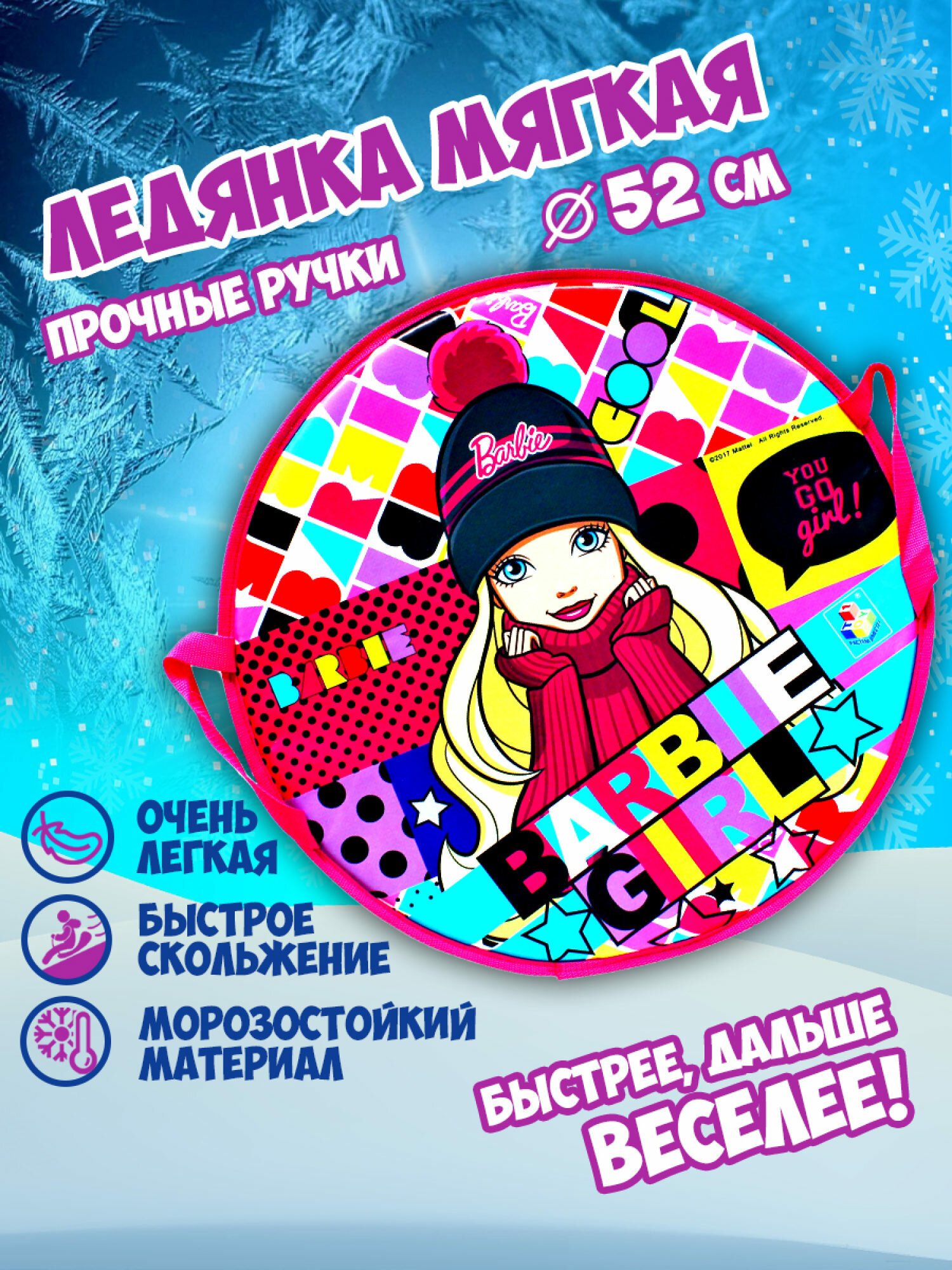 Лучшие цены. Ледянка для горки мягкая 1toy Barbie — незаменимая вещь для зимних развлечений! Ледянка большая мягкая имеет форму круга и диаметр 52 см. Ледянка с ручками, поэтому ее удобно брать с собой и носить без каких-либо трудностей. Сами ручки хорошо пристрочены и закреплены. Мягкая ледянка для горки с ручкой и рисунком легендарных кукол Барби придется по вкусу любому ребенку. Ледянка детская мягкая, удобная, приятная и легкая. Ледянка мягкая большая не требует много места для хранения. Магазины в вашем городе.