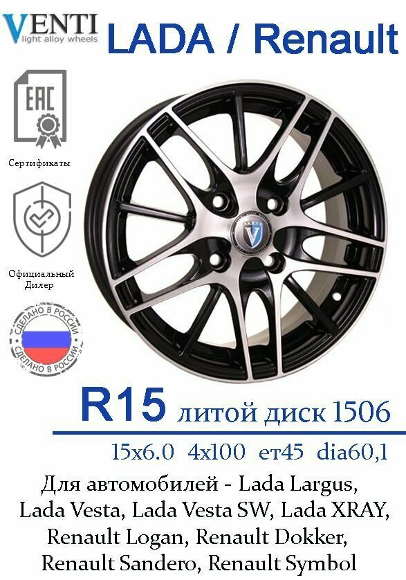 Venti 1506 BL 6x15/4x100 ET45 D60.1 5 251 ₽ Подробнее
