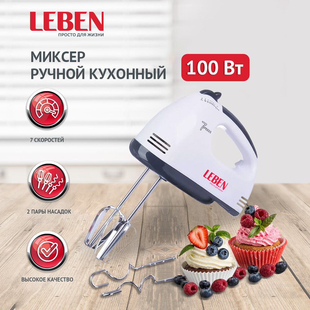 Миксеры и блендеры LEBEN Миксер ручной, 100Вт, 7 скоростей, 2 пары насадок из нерж.стали, корпус пластик