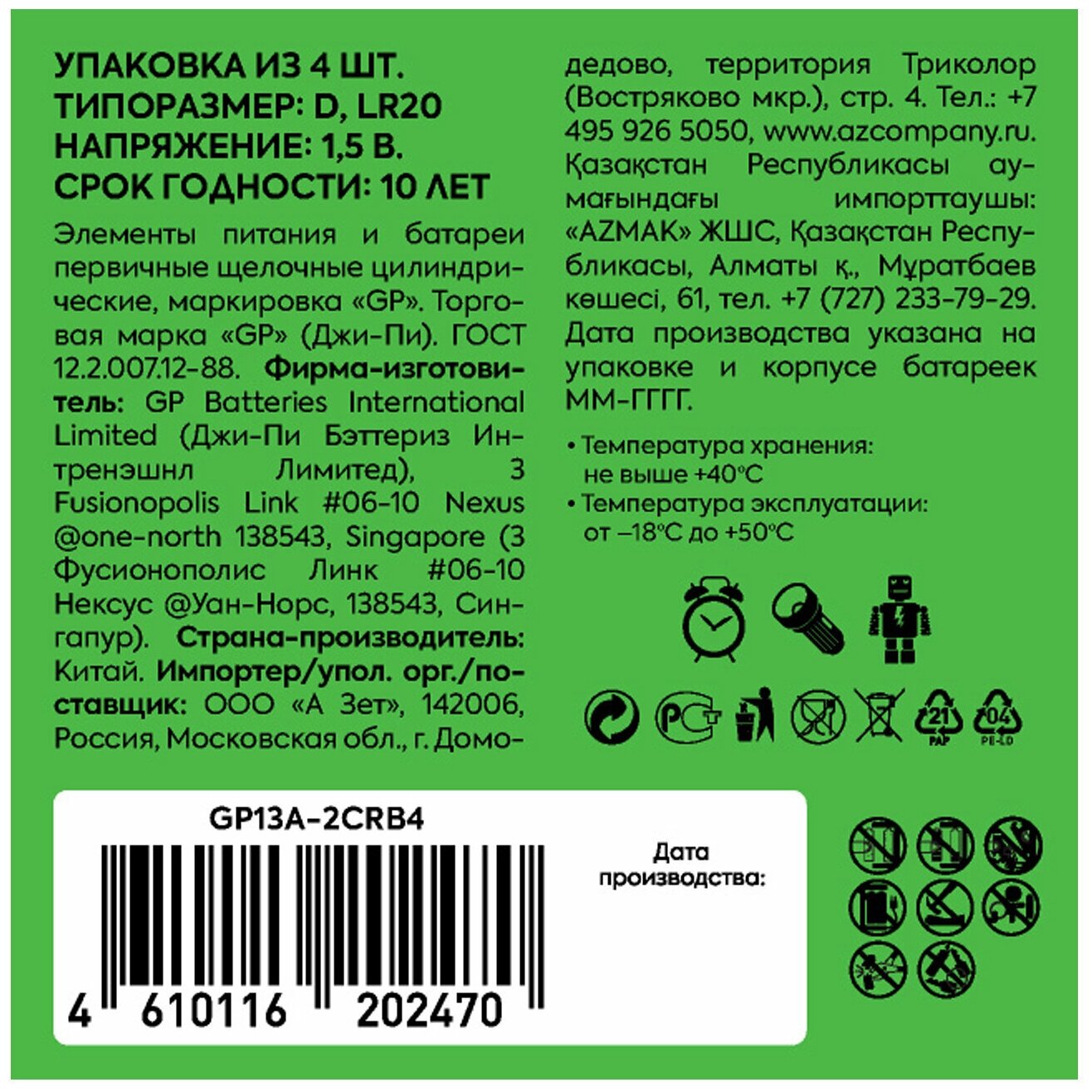 Лучшие цены. Комплект щелочных батареек из 4 шт. GP LR 20 – оптимальный вариант для бесперебойной работы энергоёмких приборов. Энергоёмкие щелочные батарейки подходят для профессиональных и бытовых устройств с большим энергопотреблением, таких как радиоаппаратура, строительные измерительные приборы, детские игрушки на радиоуправлении, мощные фонари, переносные устройства. Набора из 4-х батареек хватит надолго для бесперебойного питания всех приборов в доме. Это выгоднее, чем приобретать элементы питания поштучно. Магазины в вашем городе.