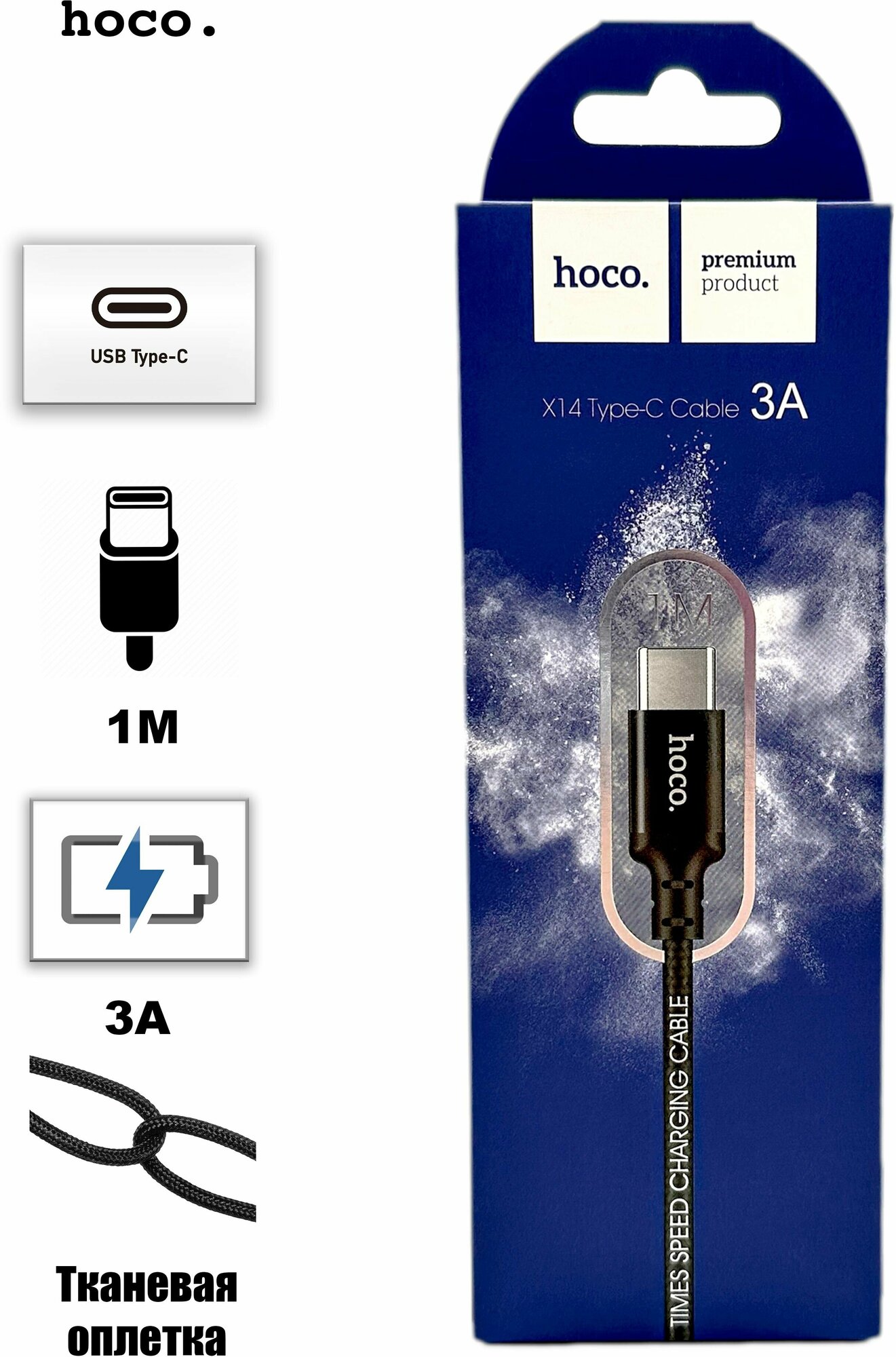 Кабель USB - Type-C Hoco X14, 2А, ткан. опл, 1м, черн