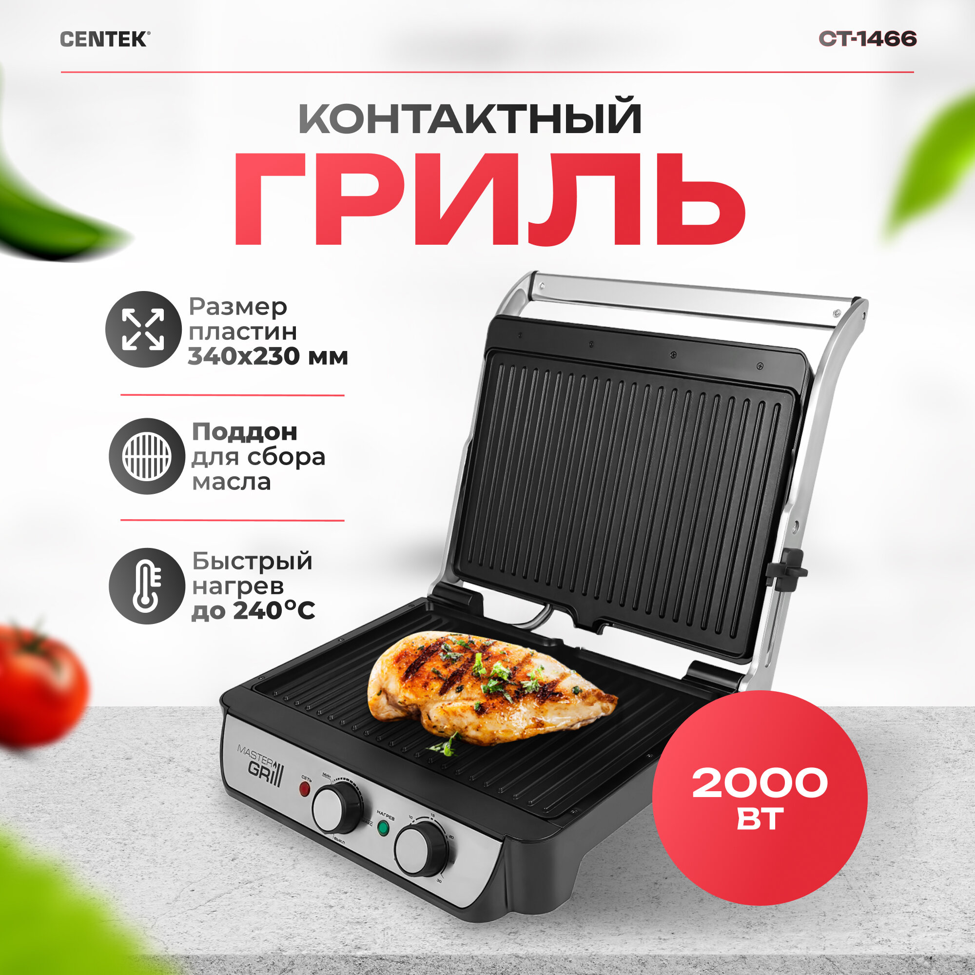 Электрогриль Centek CT-1466, 2000Вт, раскрытие на 180°, антипригар, таймер, 240 °С