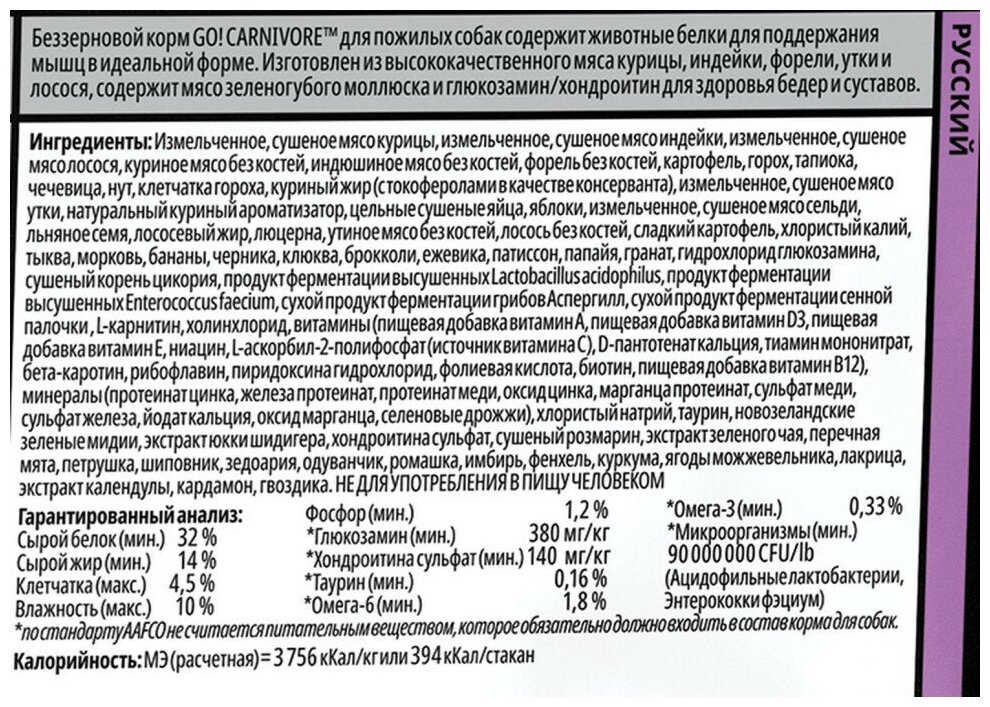 Лучшие цены. ес (кг) для склонных к полноте (гр) для активных (гр) 1-2.3 17-34 20-41 2.3-4.5 34-57 41-69 4.5-9 57-86 69-132 9-13.6 86-143 132-172 13.6-23 143-201 172-229 23-32 201-258 229-344 32-41 258-315 344-373 41-50 315-366 373-432 50-64 366-430 432-516 У некоторых собак особые вкусовые предпочтения. Сухой корм для пожилых собак Go! Carnivore Senior Chicken, Turkey, Duck & Trout содержит четыре вида мяса – курицу, индейку, утку и форель. Магазины в вашем городе.