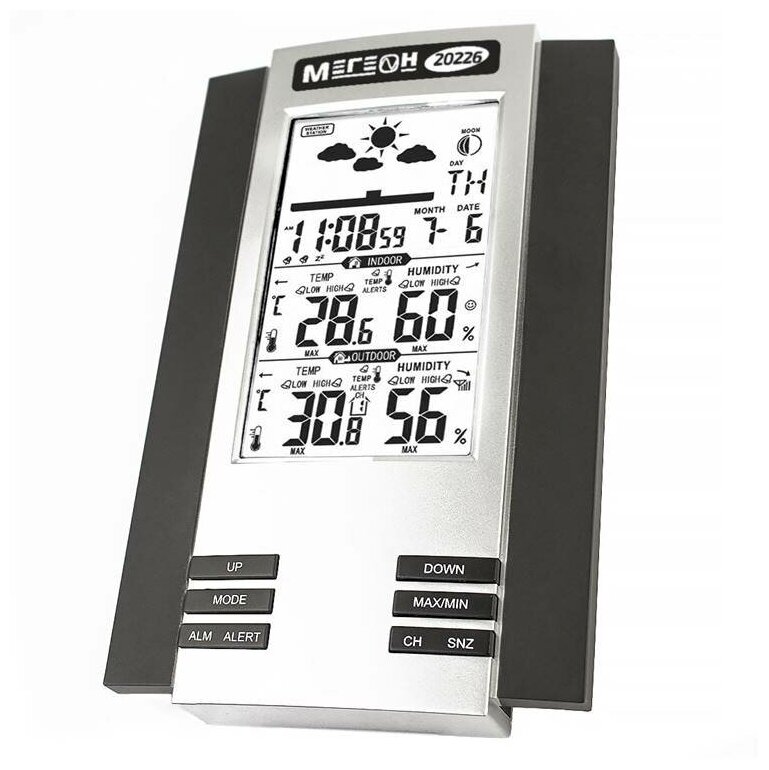 Лучшие цены. Мегеон 20226 - универсальная цифровая погодная станция с возможностью подключения до трех беспроводных датчиков температуры и влажности. Изделие имеет современный дизайн и отлично впишется в интерьер офиса и жилого помещения. Два будильника, часы и календарь не позволят Вам пропустить важное событие. Наличие функции прогноза погоды позволит Вам всегда быть в курсе предстоящей погоды. Магазины в вашем городе.