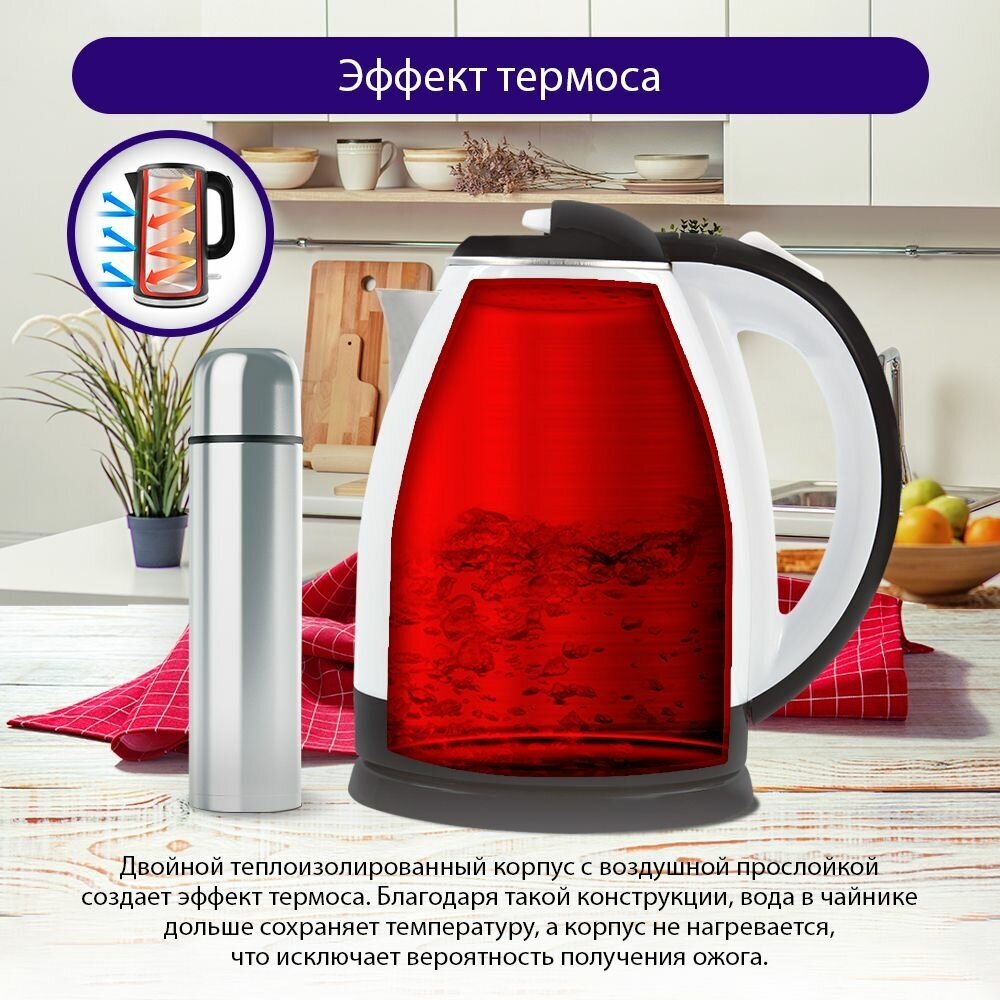 Лучшие цены. Вместительный металлический чайник-термос объемом 2.0 литра с колбой из высококачественной нержавеющей стали в цветном термостойком пластиковом корпусе для поддержания температуры горячей воды. Пищевая нержавеющая сталь способствует сохранению природного вкуса и натуральных свойств воды. Для быстрого закипания чайник оснащен нагревательным элементом мощностью 1,8 к Ватт, защищенного плоским стальным дном для равномерности нагрева, противостояния накипи, коррозии и для большего удобства в уходе. Магазины в вашем городе.