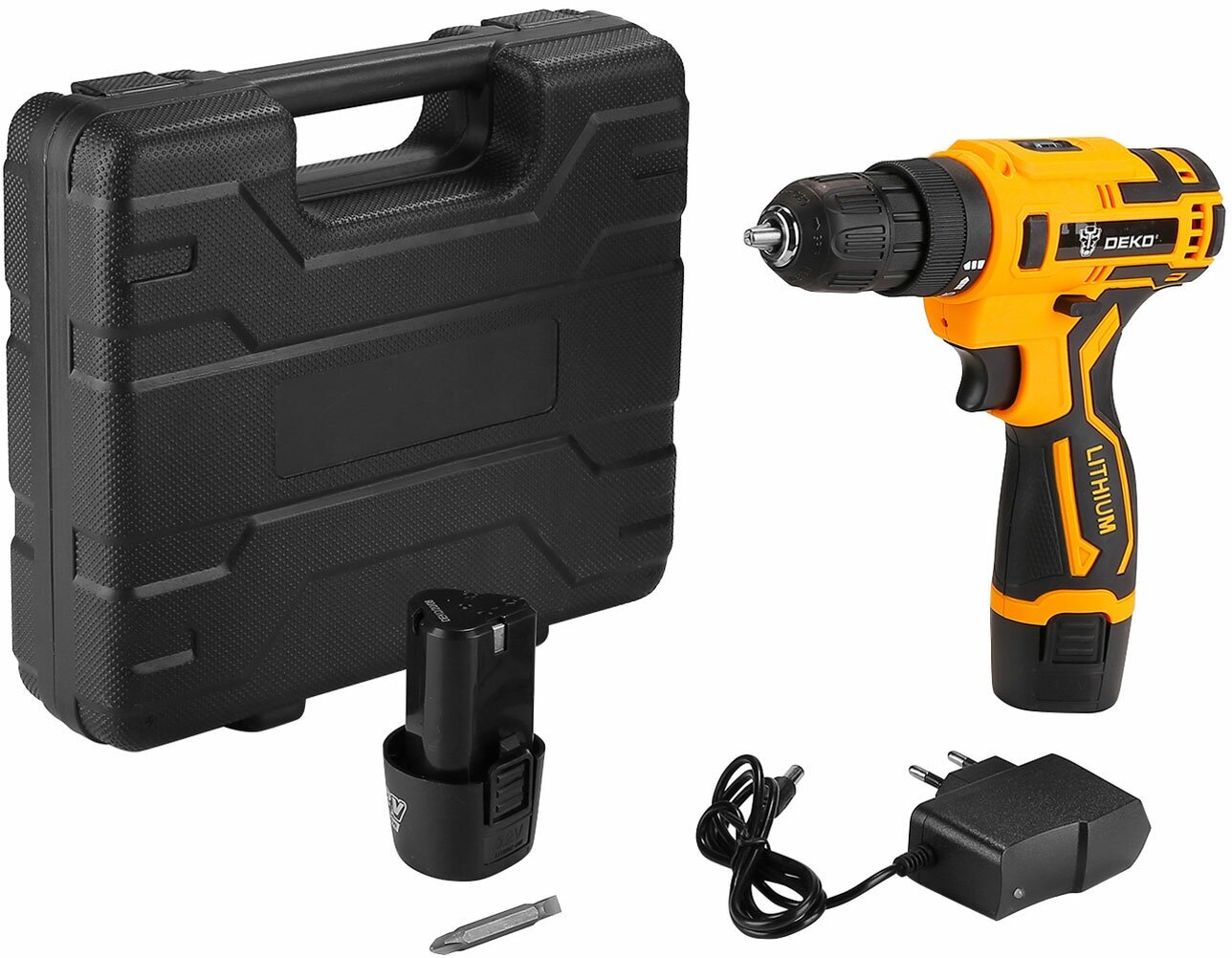 Аккумуляторная дрель-шуруповерт Deko Banger 12V SET 3 в кейсе, 26Нм, 2х1.8Ач, з/у черно-желтый