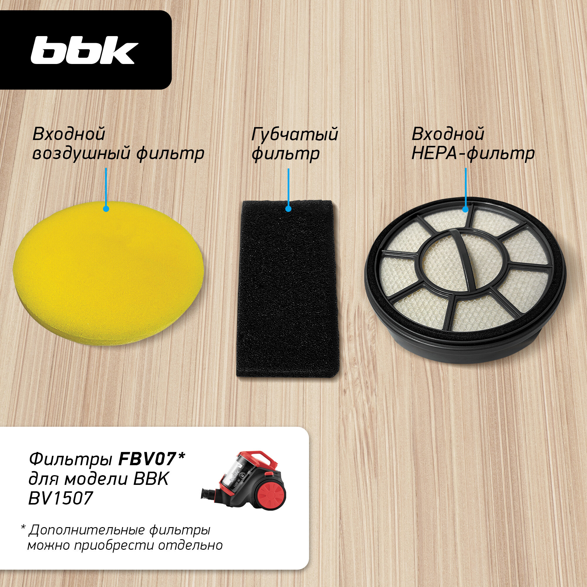 Пылесос циклонный BBK BV1507 красный/черный, мощность всасывания 245 Вт, объем пылесборника 1,5 л, сухая уборка