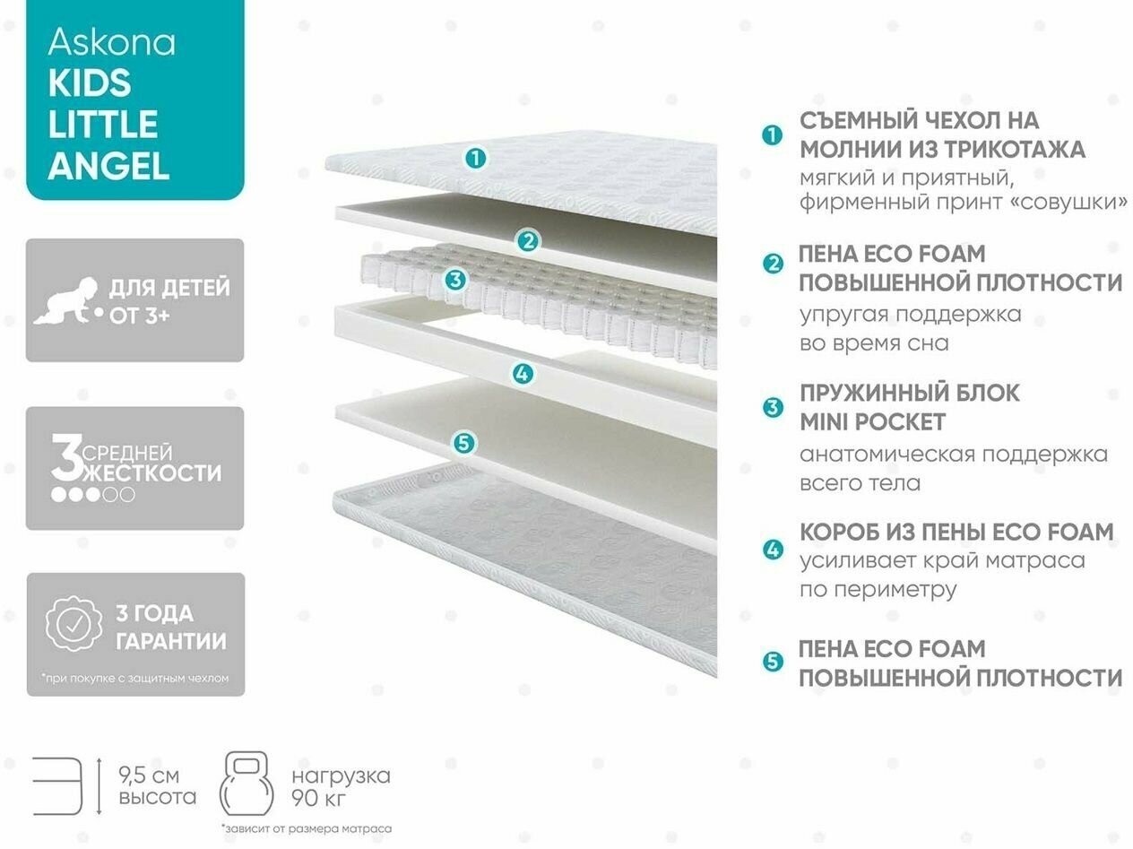 Лучшие цены. Внимание! При заказе с чехлом ASKONA в один день предоставляется расширенная гарантия 3 года https://www.ozon.ru/seller/askona-ofitsialnyy-magazin-73482/products/?from_global=true&miniapp=seller_73482&text=наматрасник Для детей 3-7 лет. В этом возрасте дети подвижны и любознательны, для комфортного отдыха во сне им необходим упругий матрас. Little Angel с анатомической пеной EcoFoam и пружинным блоком Mini Pocket снимает мышечное напряжение; способствует быстрому засыпанию; обеспечивает бережную. Магазины в вашем городе.
