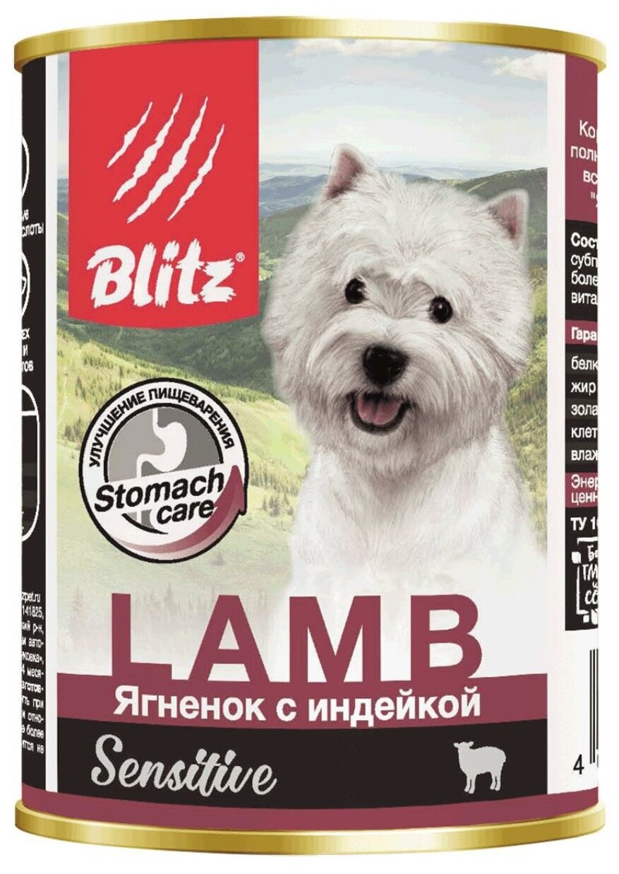 Blitz Sensitive Adult Dog влажный корм для взрослых собак с чувствительным пищеварением, с ягненком и индейкой, в консервах - 400 г х 24 шт