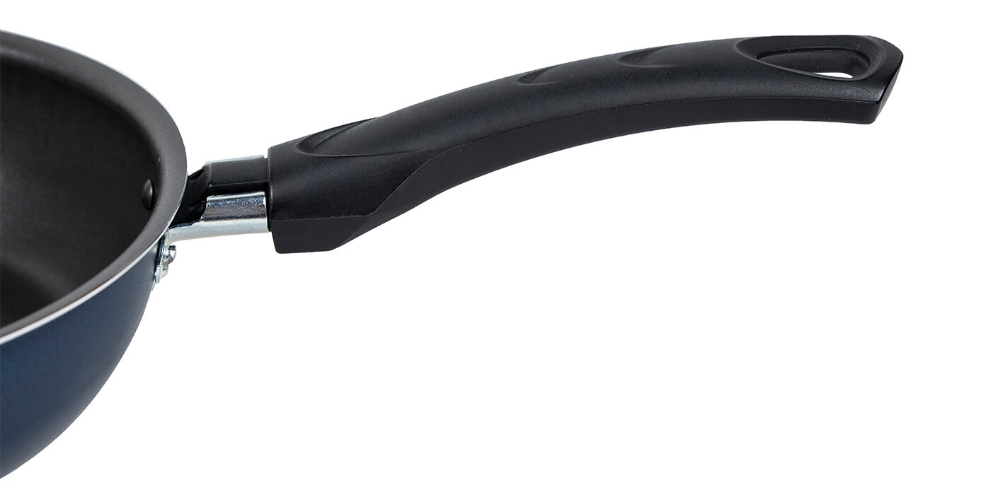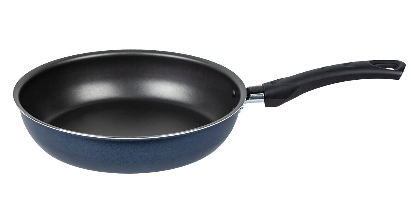 Лучшие цены. Сковорода Сатин диаметром 24 см – простая, легкая и надежная посуда на каждый день по доступной цене. Европейское антипригарное покрытие внутри надежно защищает еду от пригорания, внешний слой декоративного покрытия также имеет антипригарные свойства, легко моется и долго сохраняет аккуратный вид и насыщенный синий цвет. Прочный корпус из штампованного алюминия с эргономичной бакелитовой ручкой делает использование сковороды удобным и безопасным. Магазины в вашем городе.