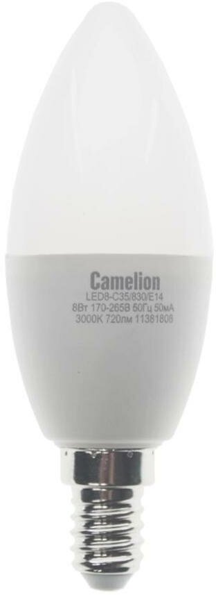 Лампочки Лампа CAMELION Е14 8Вт 3000K 720Лм LED8-C35/830/E14 светодиодная 12385 теплый белый, свеча