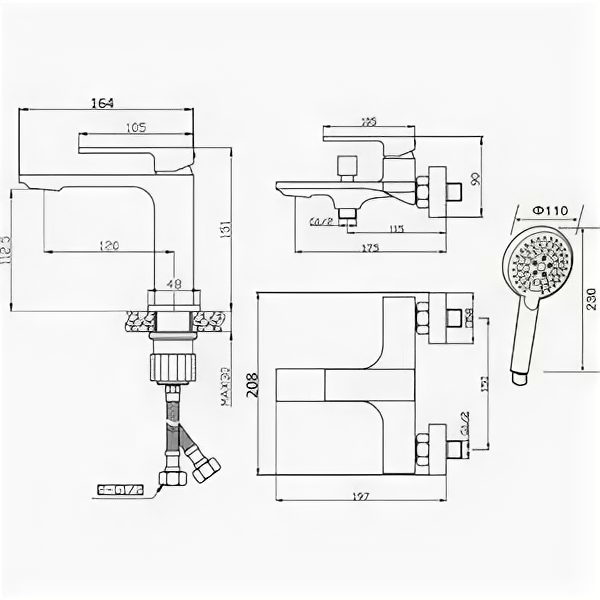 | Комплектация | смеситель для умывальника, смеситель для ванны и душа, душевой гарнитур |
