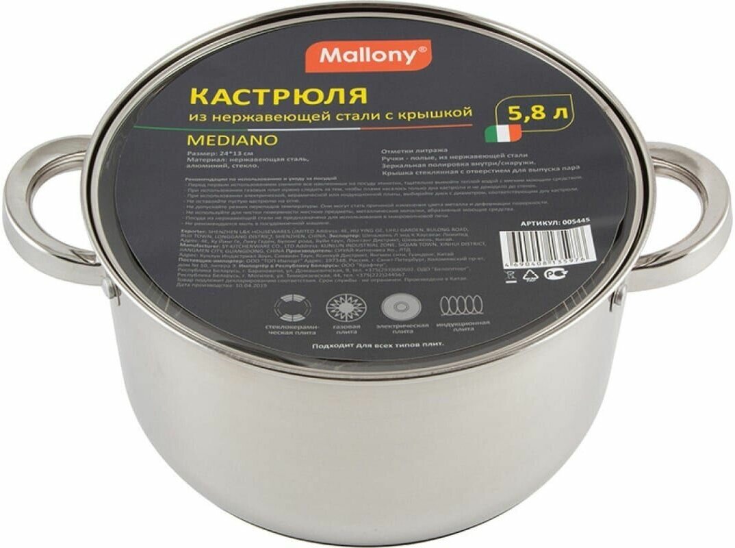 Лучшие цены. Кастрюля Mediano, объем 5,8 л, диа 24 см, из нерж стали с крышкой, ручки из нерж стали, капсулир дно Кастрюля из нерж стали с крышкой, объем 5,8 л, размер: 24*13,5 см, серия "Mediano", тм Mallony Кастрюля из нерж стали с крышкой, 5,8 л 24*13,5 см размер, литраж 5,8 л, 201 нержавеющая сталь, толщина - 0,4 мм, дно 3-слойное капсулированное - нерж сталь 201 + 1 мм алюминия + 430 сталь (толщина дна - 1,7 мм). Магазины в вашем городе.