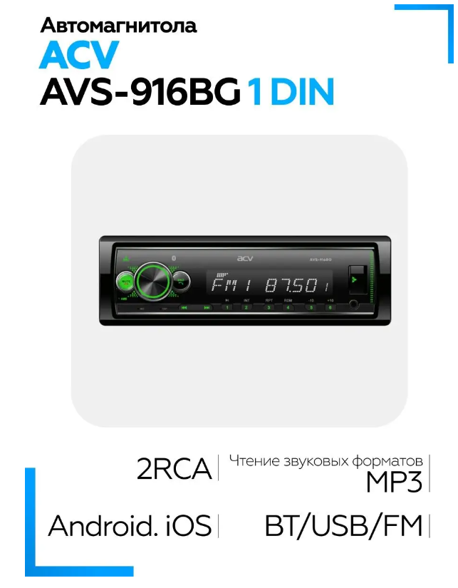 Автомобильный ресивер с Bluetooth, поддержкой ACV RC и ACV Control, зеленая подсветка ACV AVS-916BG