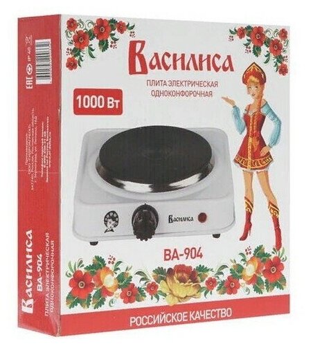 Лучшие цены. Плита компактная электрическая василиса ВА-904 поможет приготовить готовую пищу везде, где есть розетка. Это простой и привычный старшему поколению прибор, достаточно безопасный и легкий в уходе. Чугунный нагревательный элемент равномерно распределяет тепло, долго служит, для очистки его достаточно протереть влажной салфеткой, можно с моющим средством. Корпус василиса ВА-904 выполнен из прочной стали, покрытой слоем белой эмали. Магазины в вашем городе.