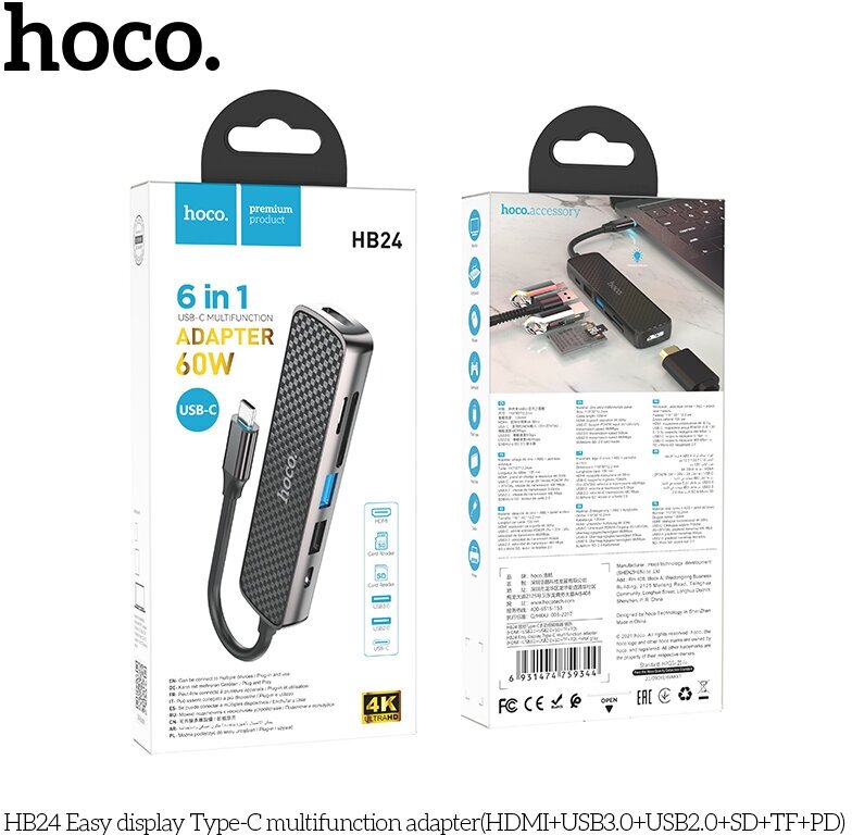 Hoco HB24 Easy display Type-C multifunction adapter(HDMI+USB3.0+USB2.0+SD+TF+PD) black