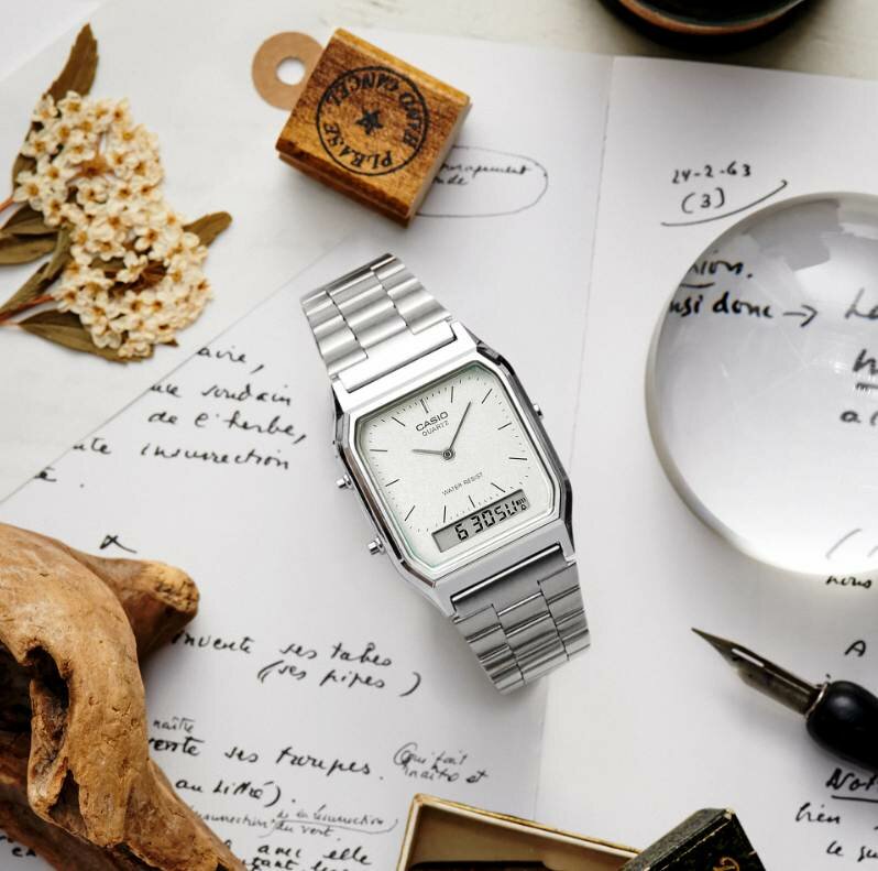 AQ-230A-7A Casio наручные часы кварцевые WR30 (3 атм) мужские, женские серебряный секундомер будильник отображение числа, второй часовой пояс, отображение дня недели, отображение месяца бесшумный механизм акриловое стекло 5 572 ₽ Подробнее