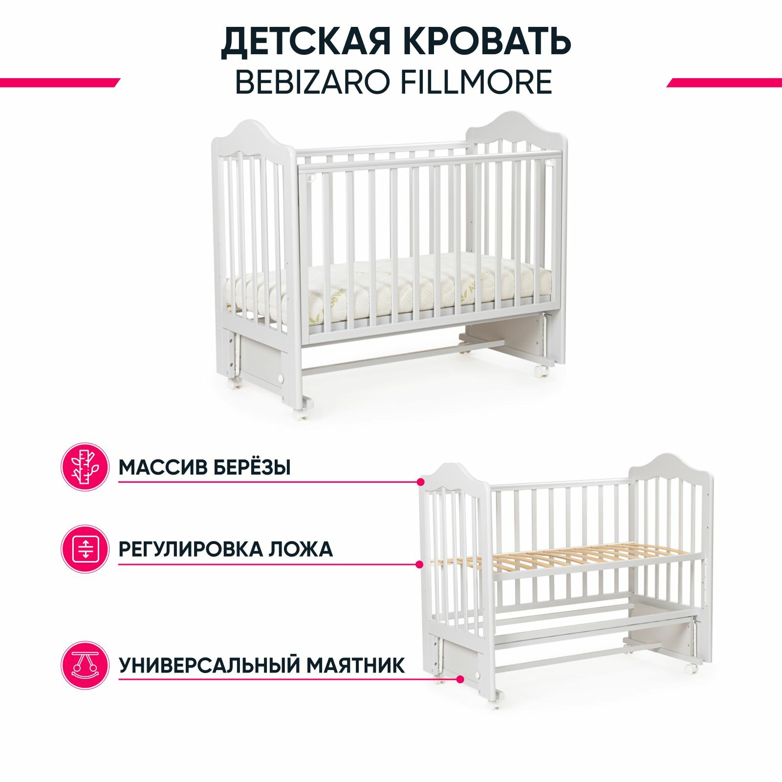 Лучшие цены. Кроватка BEBIZARO FILLMORE GRAY Универсальный маятникДетская кровать BEBIZARO FILLMORE – с универсальным маятником. Это функциональная кроватка, продуманная до мелочей, это максимальный комфорт и безопасность для вашего малыша. Каркас кроватки выполнен из массива берёзы. Для удобства родителям, боковая стенка кроватки регулируется по высоте. Модель оборудована колесами для её перемещения по комнате. Магазины в вашем городе.